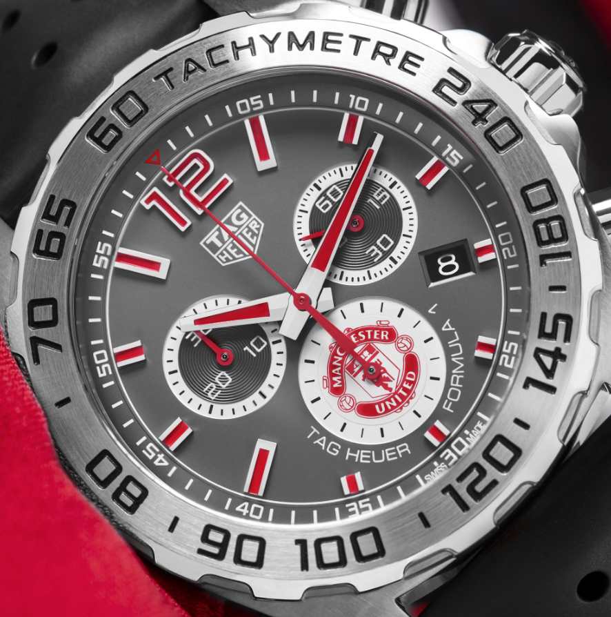 Con un estilo más sobrio, el nuevo TAG Heuer Formula 1 se caracteriza por tener una caja de 43 mm de diámetro de acero satinado con cristal de zafiro plano y un bisel fijo con taquímetro. Al fondo de la caja, se podrá apreciar el logotipo del Manchester United grabado en acero.