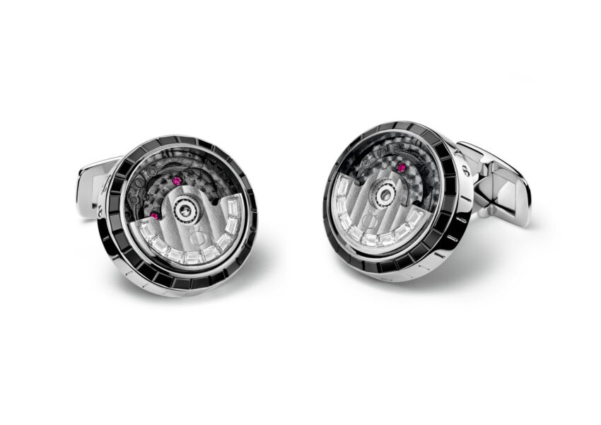 El reloj no es la única joya masculina. Milus lo sabe, por ello en 2006 creó sus famosas mancuernillas “relojeras”, con un rotor oscilante sobre 360° en función de los movimientos del portador. Un diseño patentado que se inspira en un auténtico movimiento mecánico automático. Desde entonces, esta colección ha experimentado un gran éxito y se ha presentado en numerosos modelos y diferentes estilos. Los biseles de ambas cajas están engastados cada uno con 24 diamantes negros corte baguette, una piedra poco común a la que pretende asemejarse el tratamiento blackor del movimiento. En lo que respecta a las masas oscilantes, su perímetro está iluminado por 8 diamantes blancos también corte baguette. Este juego de luz y de color se realza por medio de unos acabados que recuerdan a los de los movimientos mecánicos más hermosos, entre ellos, la tradicional decoración “Côtes de Genève” en el rotor y unos puentes finamente perlados.