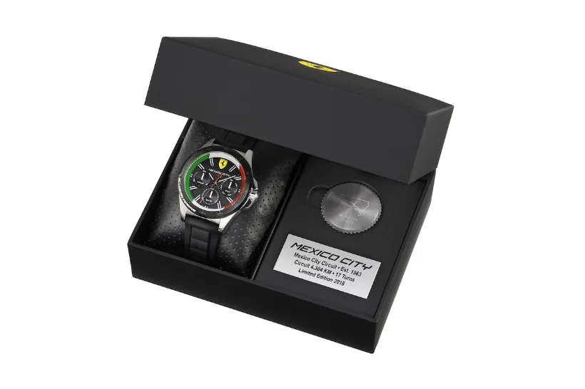 Una pieza desarrollada exclusivamente para celebrar la fiesta de la máxima categoría en el Autódromo Hermanos Rodríguez, y llevar la emoción de las pistas a la muñeca de todos a quienes nos hace vibrar la velocidad y los buenos autos, el rugir de los motores y los relojes con gran carga deportiva. Además, al unir el diseño con los códigos de nuestro país y de la marca del cavallino rampante, tenemos lo mejor que puede llevar un real entusiasta o coleccionista de piezas únicas.