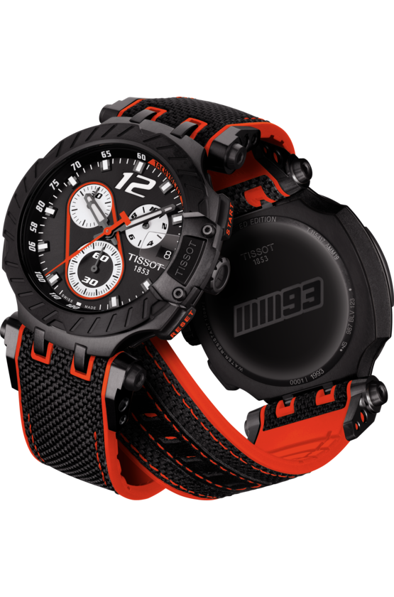 Está desarrollado en homenaje al piloto y a su impresionante carrera. Cuenta con pulsadores color rojo y agujas a juego. Mientras se abraza mediante un cinturón de caucho vulcanizado que hace guiño a la pasión de Marc por la velocidad.