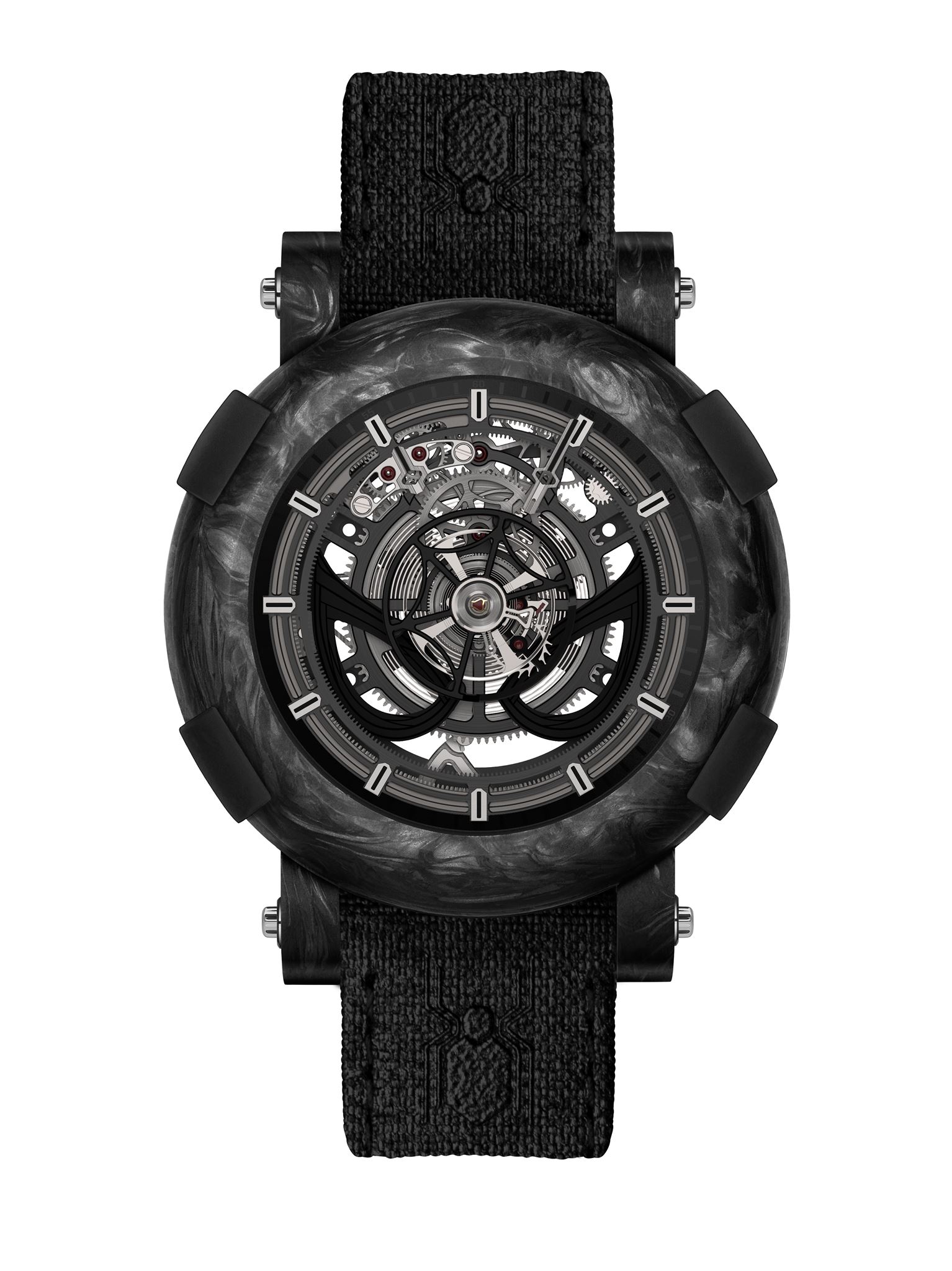 MT: Tenemos que ir años atrás, cuando yo estudiaba ingeniería. La idea que surgió fue la de desarrollar un mecanismo con tourbillon al centro. Para hacerlo, había que introducir un enorme barrilete para contener una enorme cantidad de energía. Cuando lo presenté al señor Jean-Claude Biver, él me contrató como parte de su equipo en Hublot. Pero decidimos que no era apropiado lanzarlo en esta marca, debido a que había ya demasiados proyectos. Ahora lo vemos en RJ, un movimiento de Alta Relojería de Edición Limitada a 10 piezas en color negro y 10 en color rojo, que son un homenaje a Spiderman, nuestra más reciente colaboración con Marvel.
