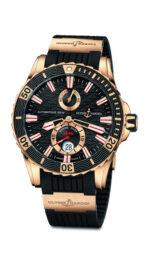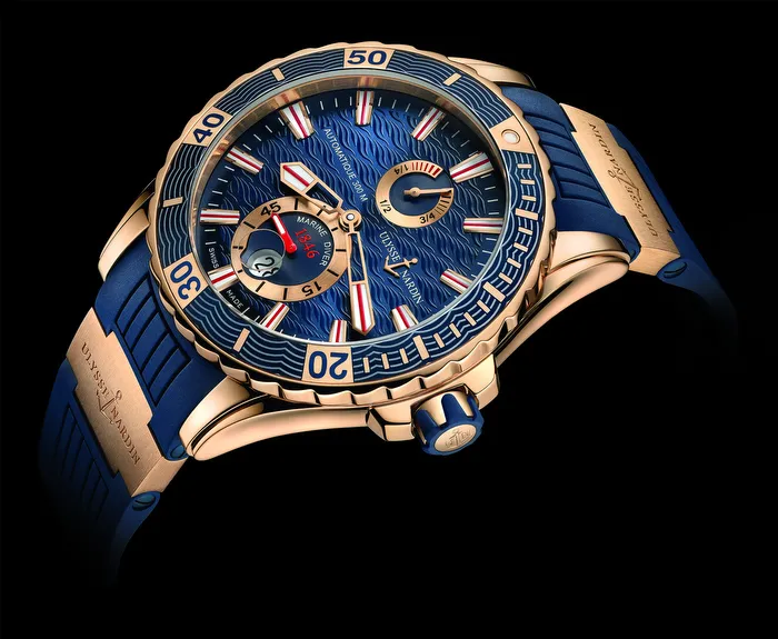 Uno de los modelos más gustados de Ulysse Nardin ahora está disponible en oro de 18 quilates. El Marine Diver que lleva en su diseño el inconfundible ADN de Ulysse Nardin está equipado de un calibre automático UN-26, ofrece una reserva de marcha de 42 horas e indica, además de las funciones horarias, la fecha en una ventanilla situada a las 6 y la reserva de marcha en un contador a las 12.