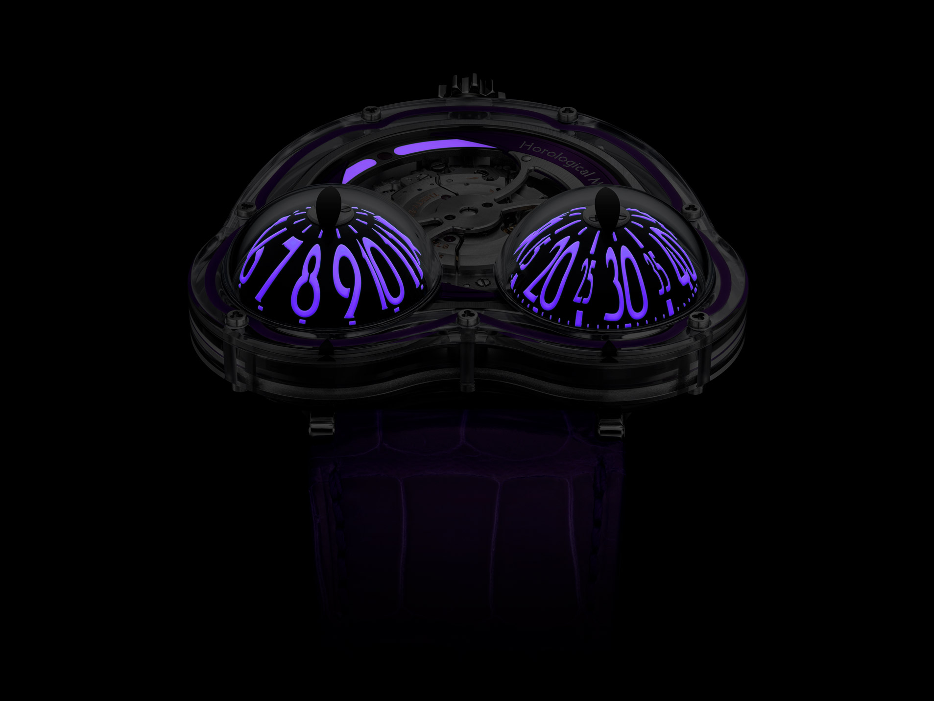- Caja: 48.3 x 52.7 x 17.5 mm de cristal de zafiro; cúpulas de zafiro con tratamiento antirreflejos: junta de color azul, morado o turquesa según la versión