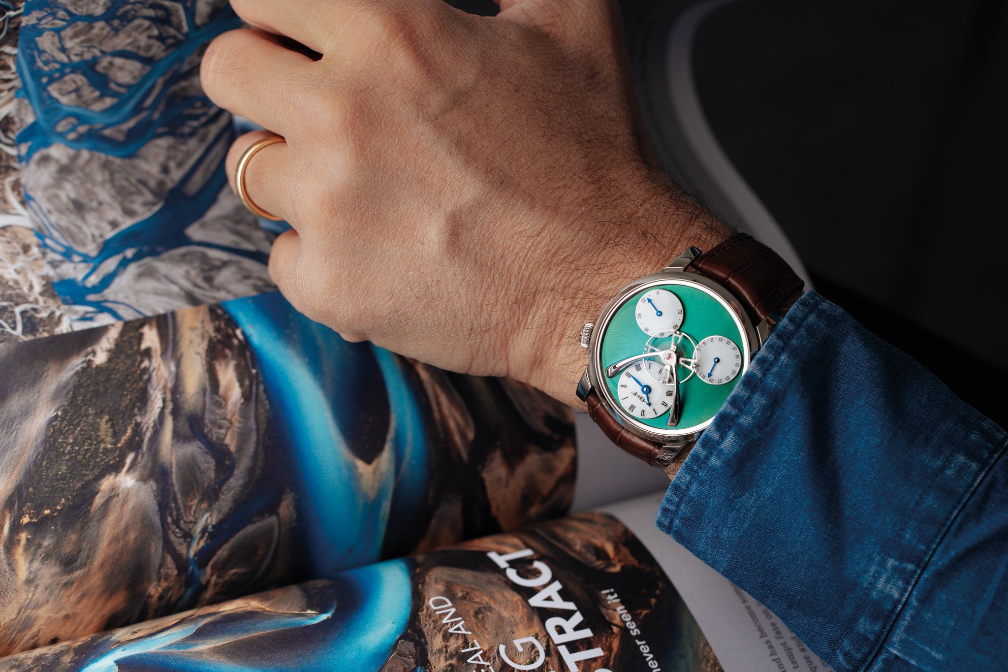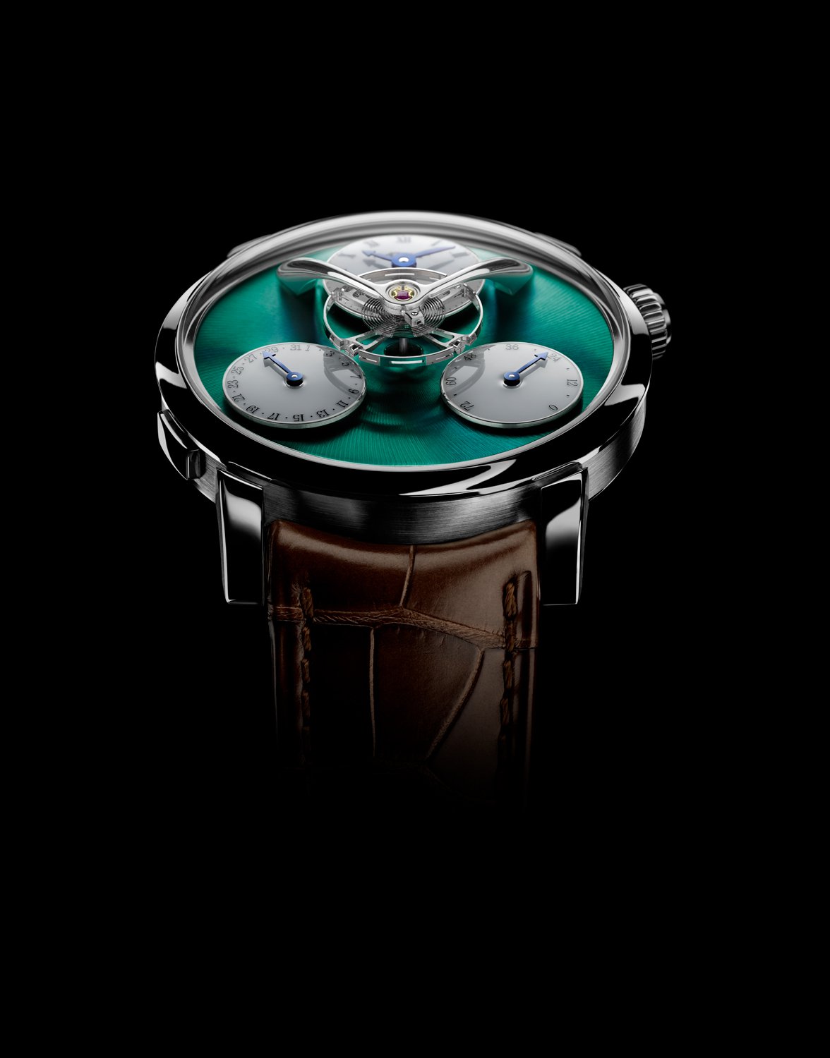 Los relojes antiguos que lucían este tipo de acabado empleaban baños de ácido para lograr dicho efecto, pero los métodos modernos que reproducen el escarchado consisten en bruñir manualmente la superficie de metal con un cepillo metálico. La LM Split Escapement de titanio es una celebración de esta técnica, realizada íntegramente a mano en las 72 piezas que conformaron las ediciones de lanzamiento. Ahora son 5, y ésta con carátula verde es mi favorita.