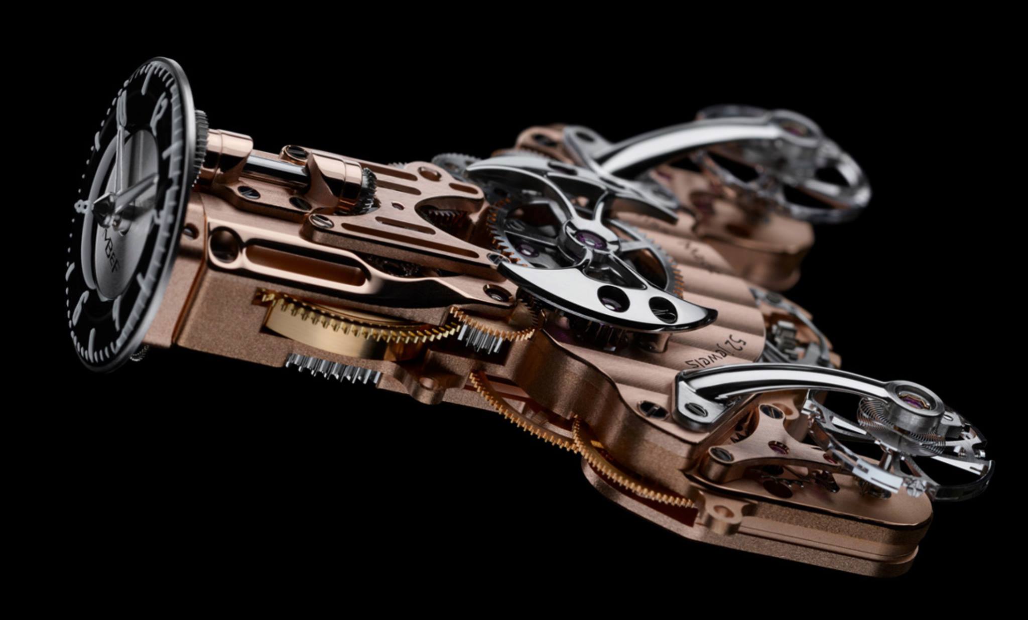En sintonía con un mejor coeficiente aerodinámico para la carrocería, un chasís dedicado da sostén a una verdadera proeza mecánica con sello de la casa. Es decir, es un movimiento manufactura que debe mucho de la inspiración a las máquinas HM4 Thunderbolt y al HM6 Space Pirate. Posee un doble volante cuya frecuencia es de 18 mil alternancias por hora (2.5) para cada uno de los órganos, mientras que un diferencial planetario conecta y brinda un rate de precisión que dará como resultado una gran precisión exhibida a través de las horas y minutos.