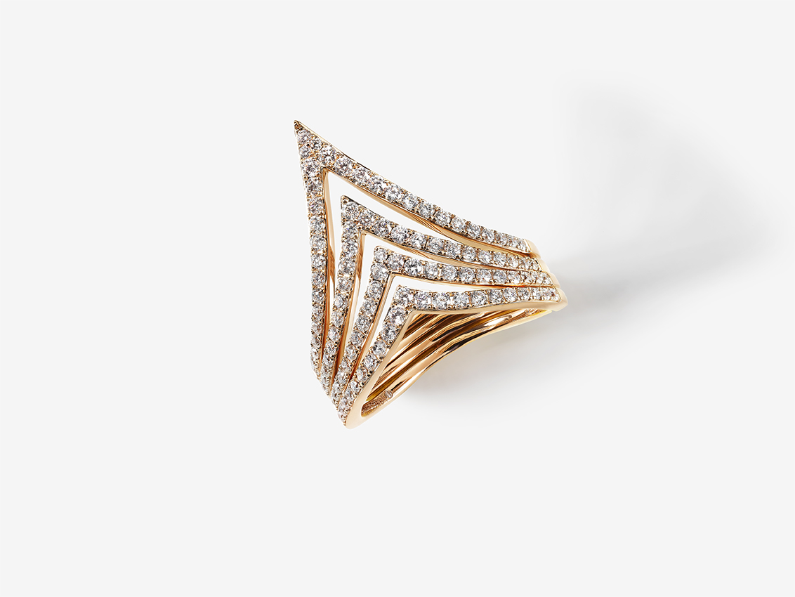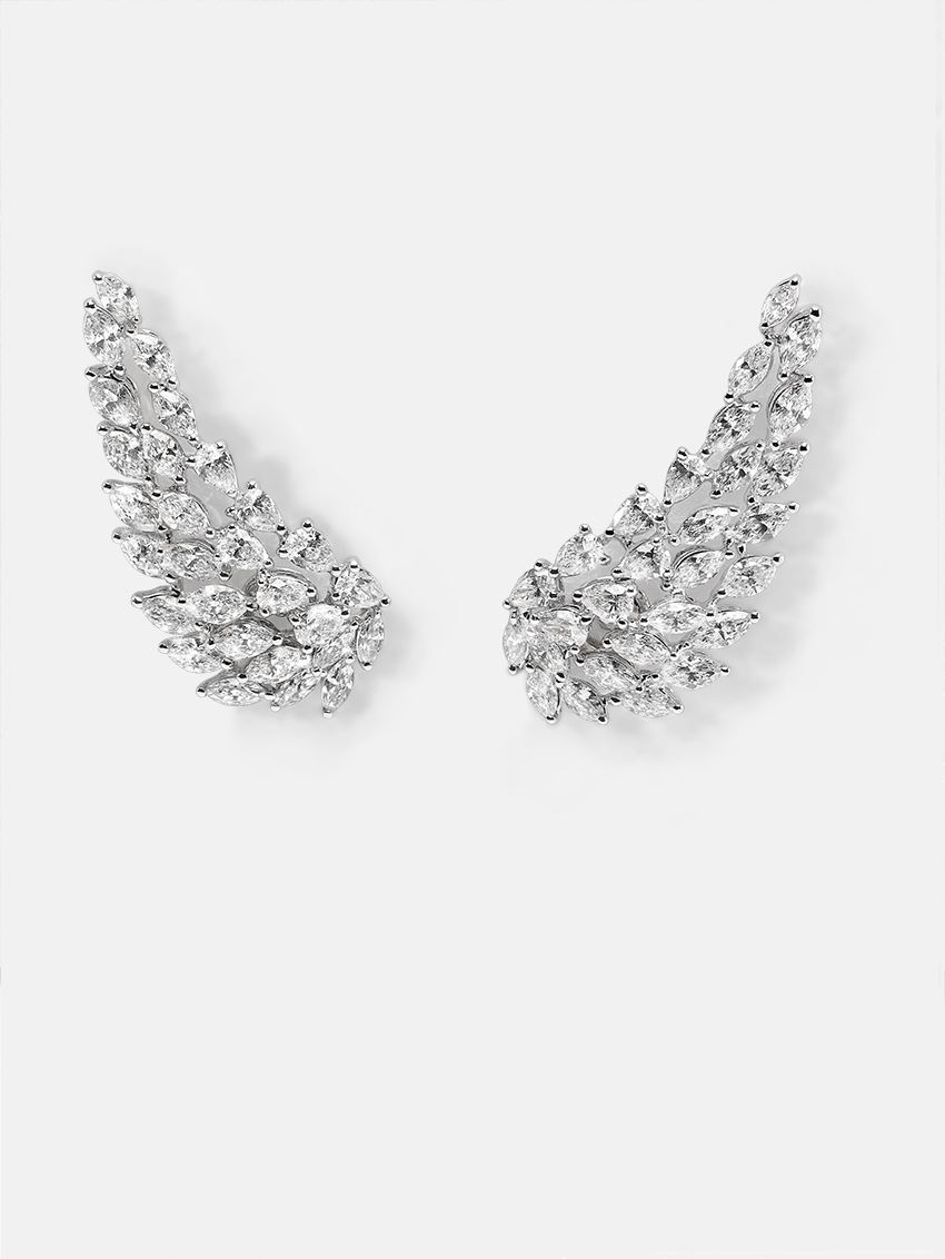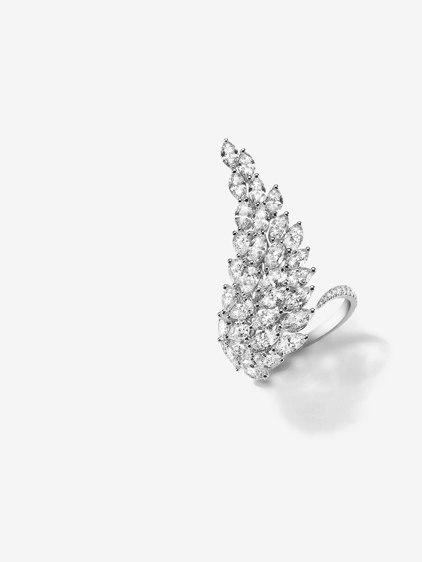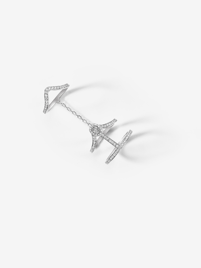 Unidos entre sí, esta colección dibuja sutilmente el corte de las piedras y las convierte en alas de diamante. Desafiando los códigos tradicionales, estas creaciones muestran un espíritu peculiar brindando a las mujeres un aspecto elegante y casual.