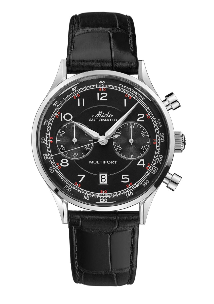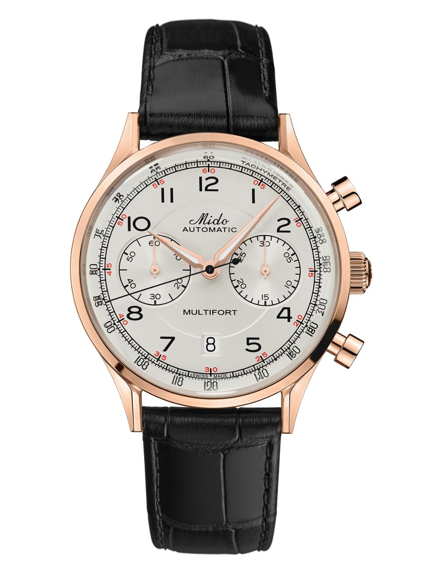 ¡Disponible ahora en WW Shop! MXN $44,400.00Mido Multifort Patrimony luce una carátula graduada con taquímetro, escala que puede ser aprovechada gracias al sistema de cronógrafo incluido este año. Inspirado directamente en el Multifort Multichrono de 1937, se presenta en una caja con un diámetro de 42 mm, pero con un bisel muy delgado, cuernos cónicos de gran tamaño y pulsadores tipo bomba bastante apegados a la década de los 30.