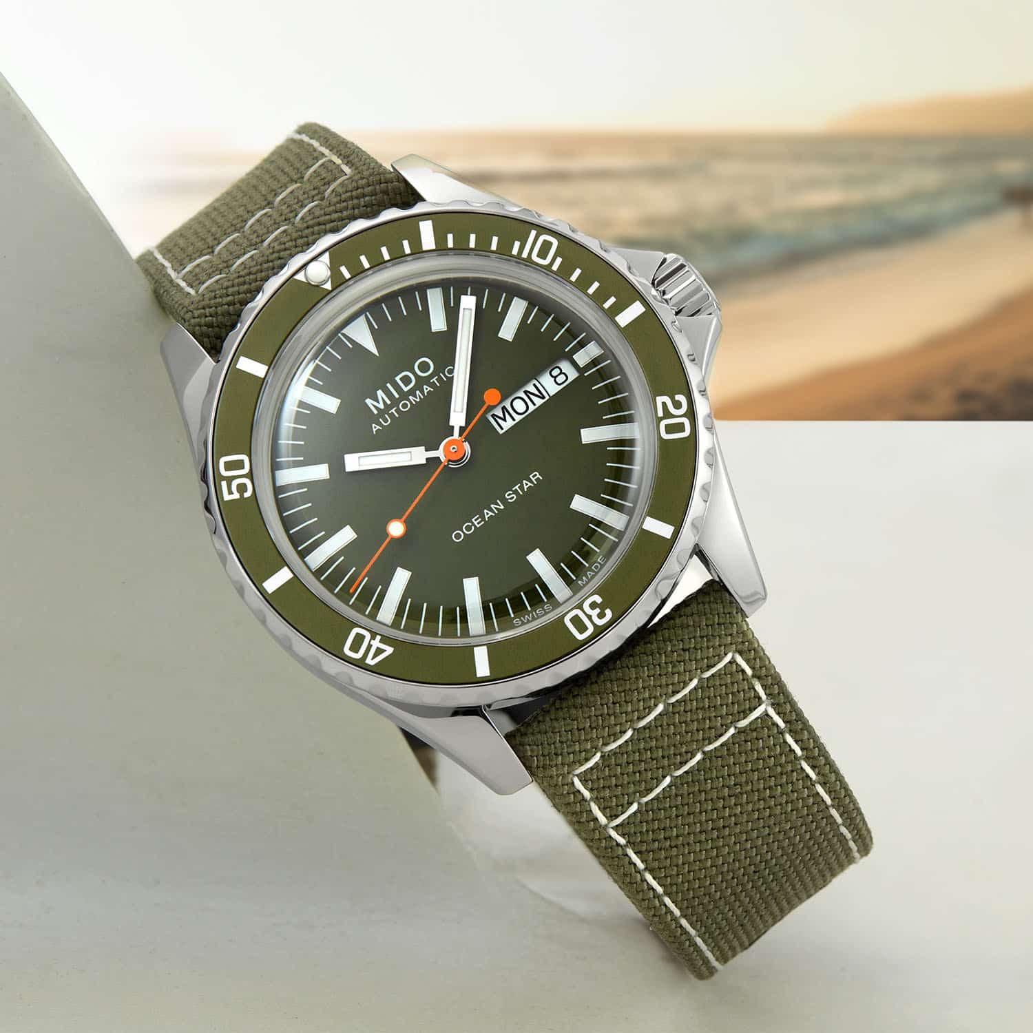 - Correa: tela caqui o azul navy con costuras en contraste, hebilla pulida con logo de Mido en relieve; brazalete de acero inoxidable