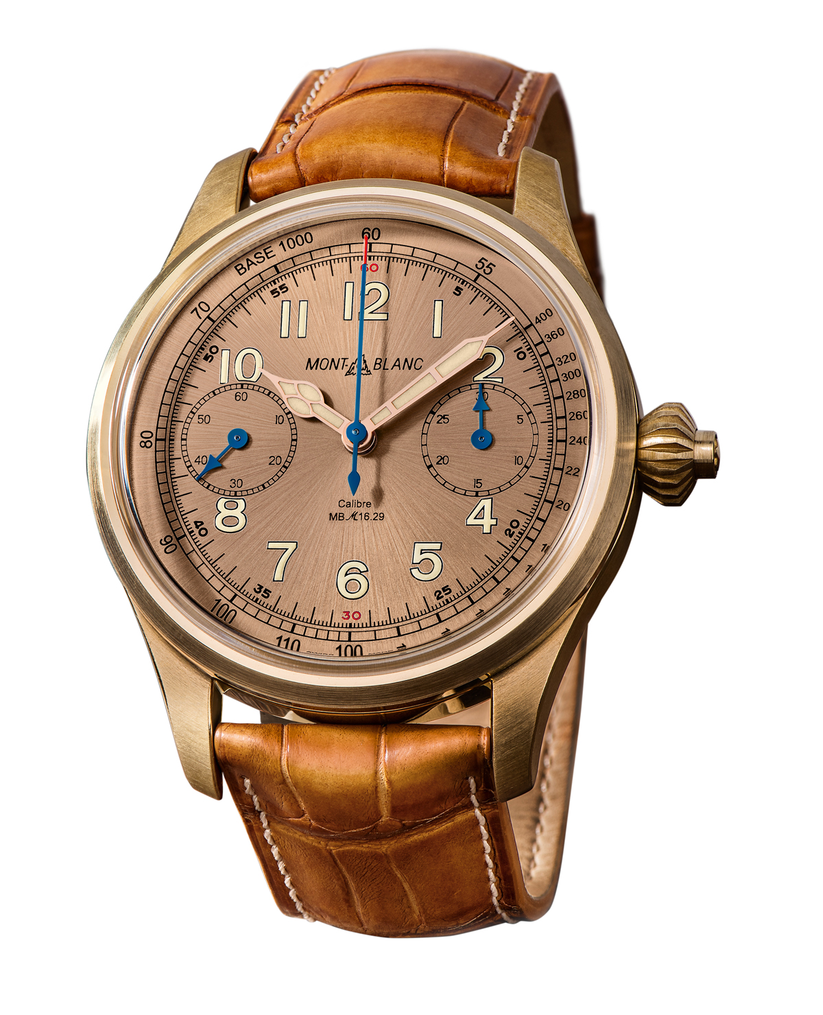 En este caso, ambos códigos se complementan para ofrecer una referencia llena de estilo. El [color azul en las agujas del cronógrafo, luce una construcción de acero,] la cual destaca a simple vista. La caja –hecha de bronce– se apega a la estética general de la colección 1858, dando vida a un espíritu vintage sumamente atractivo inspirado en los cronógrafos de la década de los 30.