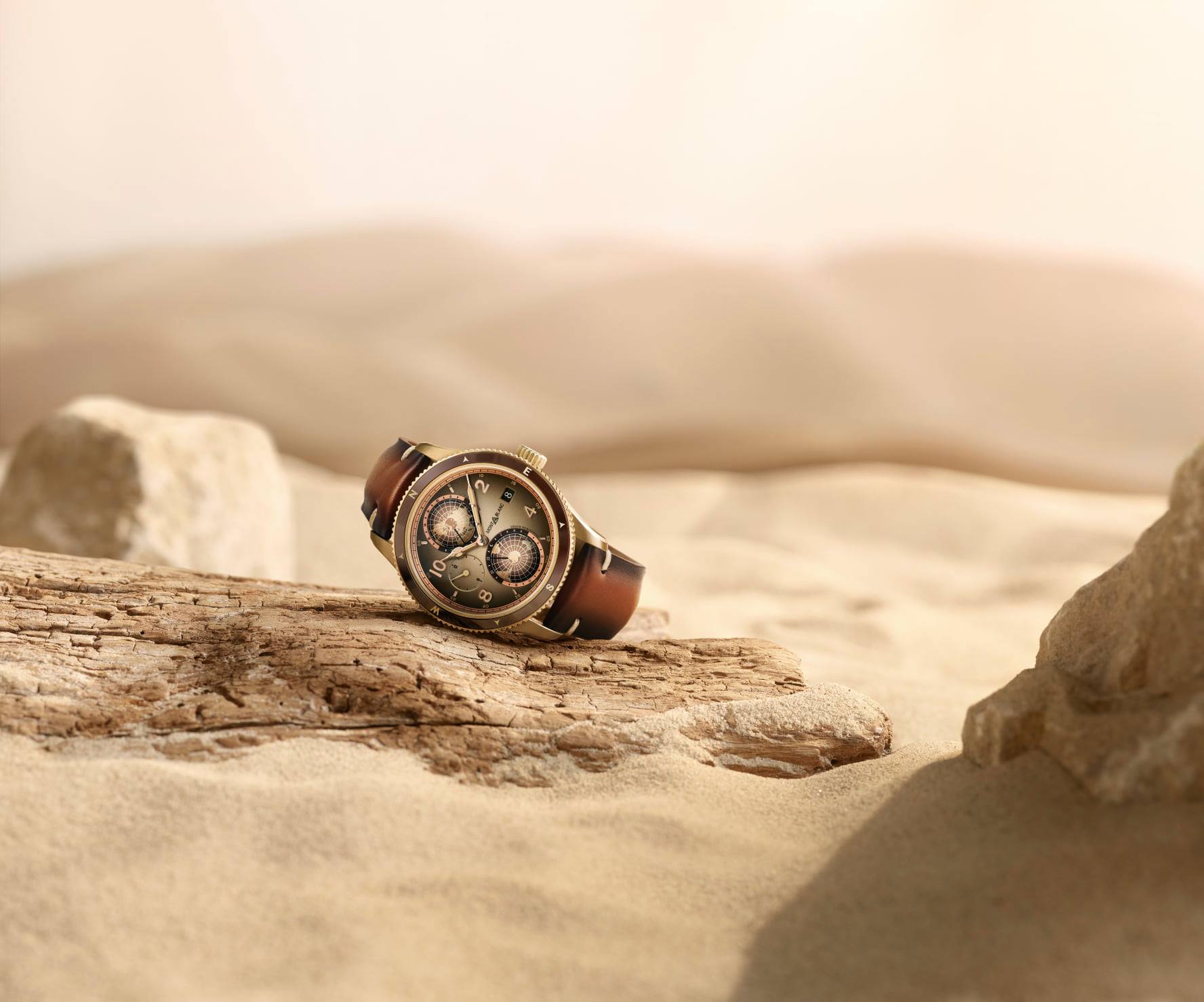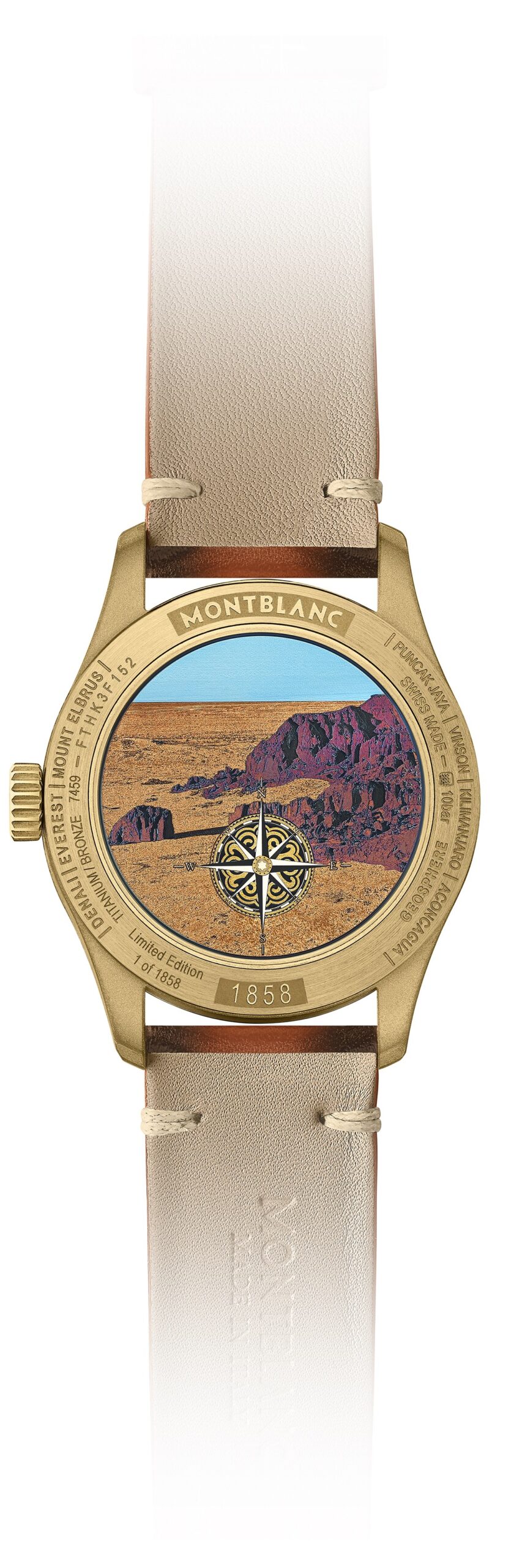 El Montblanc 1858 Geosphere reproduce el esquema de color del terreno rocoso, el reloj combina armoniosamente la caja de bronce pulido con un grabado especial en la parte posterior; un bisel bidireccional de cerámica marrón brillante, una carátula lacada en marrón ahumado y beige y una correa de becerro Sfumato marrón vintage a juego.