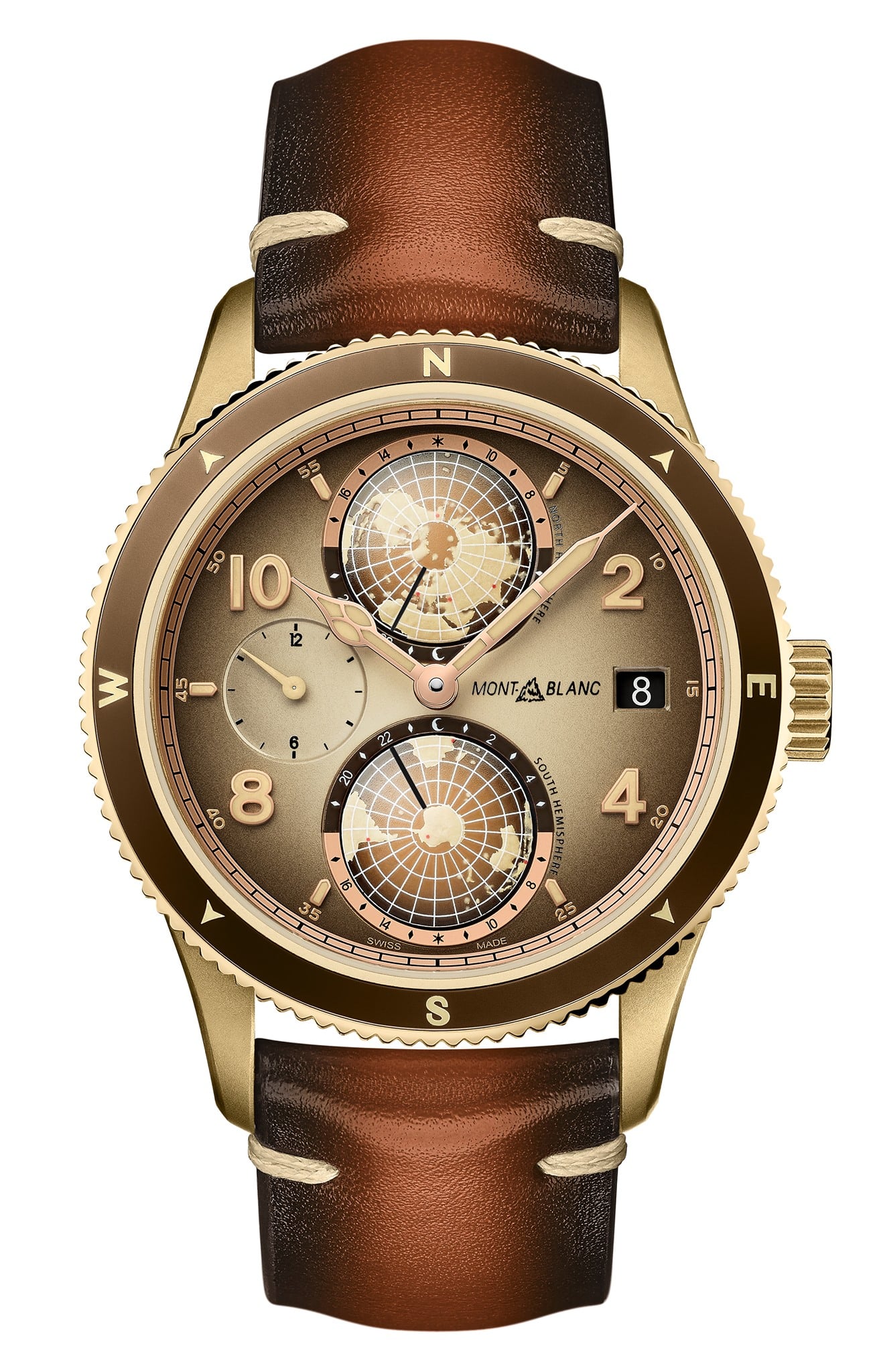 Porta el calibre automático MB 29.25 (base SW-300-1 con módulo manufactura). Esta complicación distintiva muestra dos hemisferios que brindan una forma instintiva de leer diferentes zonas horarias. El reloj tiene dos globos de hemisferio abovedados a las seis y a las 12 en punto, que están rodeados por una escala fija con las 24 zonas horarias e incluyen un indicador de día/noche marrón y recubierto de oro rosa (para los hemisferios norte y sur) . El meridiano de referencia de longitud para ambos hemisferios está resaltado con una línea negra recubierta con Super-LumiNova®. Además, una segunda zona horaria, que se utiliza como indicación de la hora local, está ubicada a las nueve en punto y una apertura de fecha (vinculada a la hora local) está ubicada a las tres en punto.