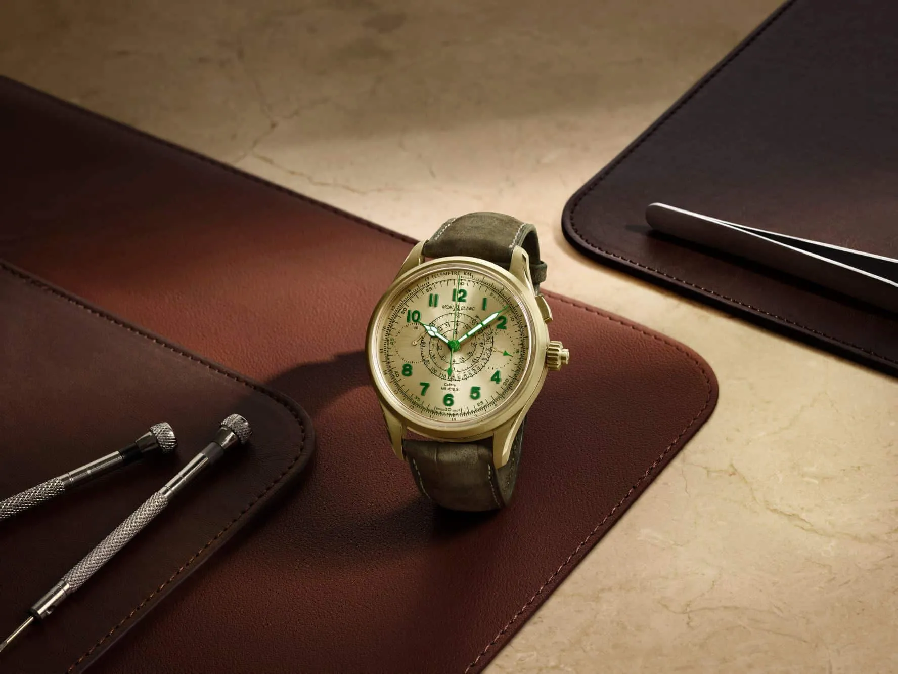 Como nace de los cronógrafos militares de Minerva, en esta ocasión la carátula también presenta un dorado destacado con vivos en verde, que van a juego con la correa nobuck verde al estilo vintage. Las agujas de las horas y los minutos luminiscentes en forma de catedral, el temporizador, la aguja central de fracción de segundo, el taquímetro y las escalas del telémetro son sello de la Maison. El emblema histórico de Montblanc a las 12 horas.