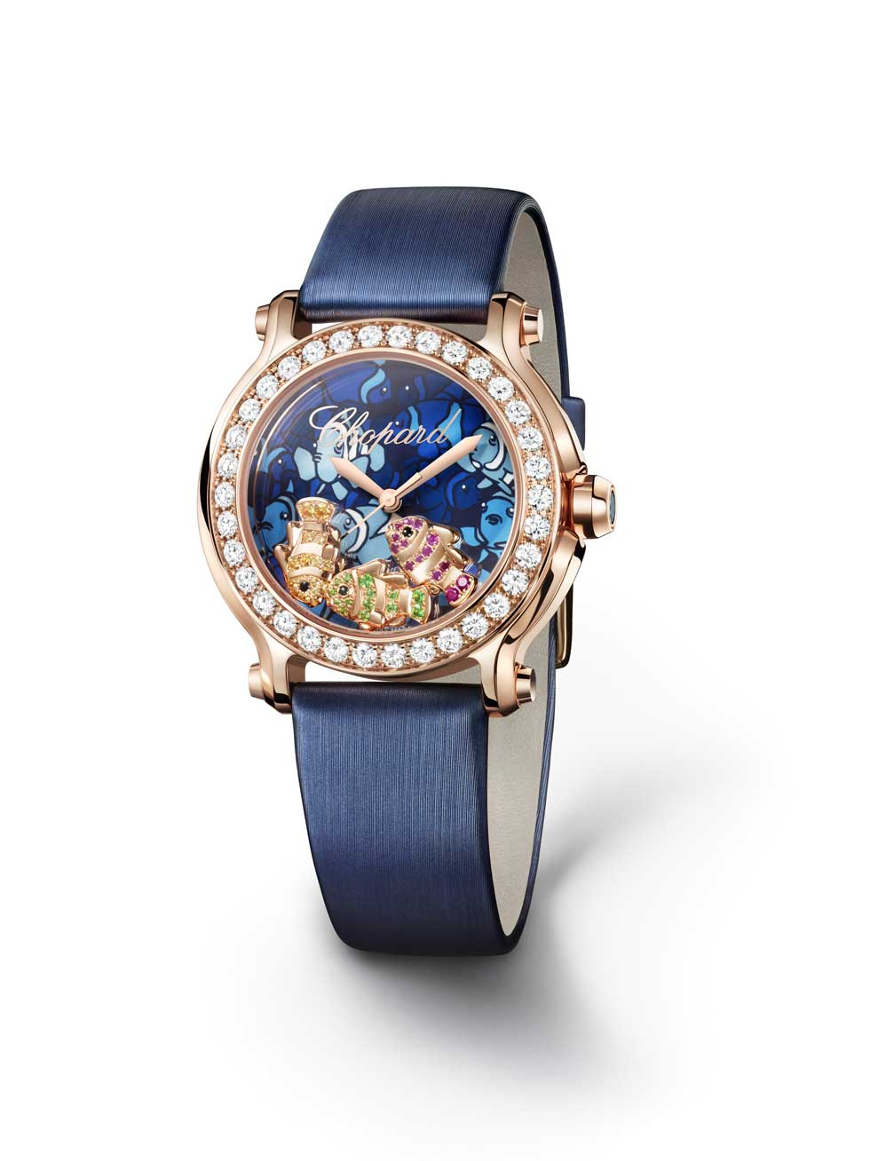 - Chopard Este año, el modelo Happy Fish -de la colección Happy Sport- destaca por la magia multicolor de las profundidades. Tres pececitos payaso realizados en oro rosa de 18 quilates, engastados con zafiros, tsavoritas, rubíes y ónices, nadan sobre la carátula que simula un arrecife de coral. La correa de raso azul -a juego con el conjunto- acompaña al bisel, el cual presenta un engaste de diamantes que invitará a cualquiera a descubrir los misterios del océano creativo de la firma.