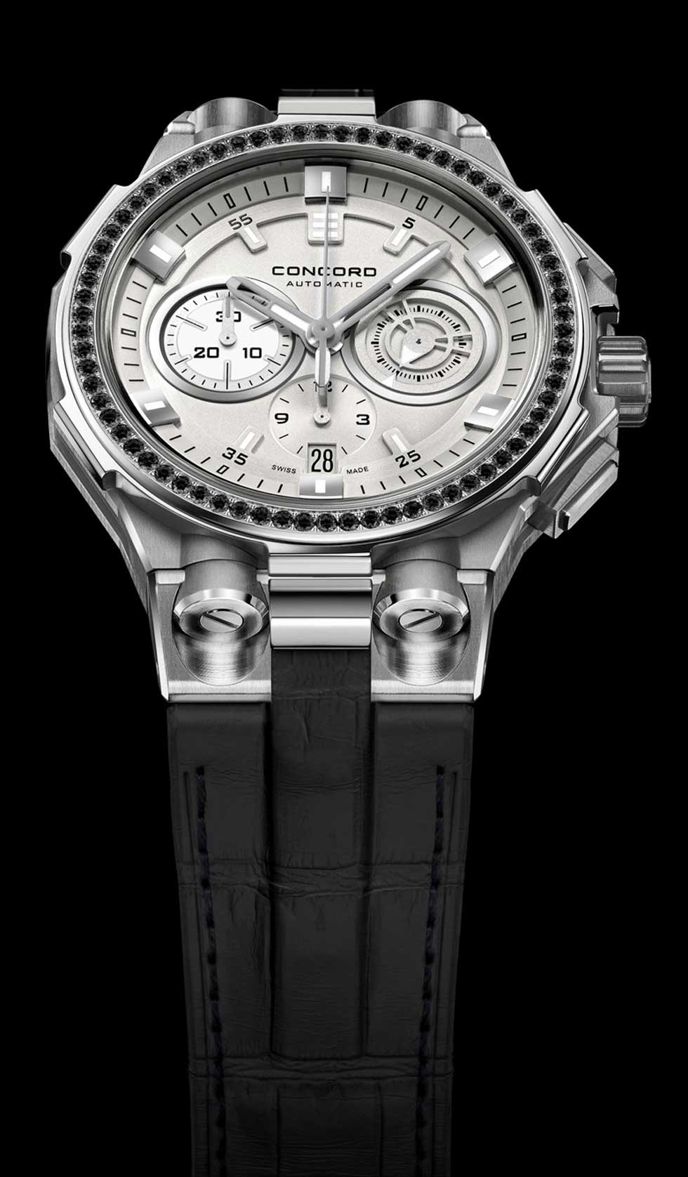 - Concord La feminidad audaz y decidida es parte de la sociedad moderna y reflejo de la elegancia que se desprende del Black Frost. Diamantes negros y brazalete en piel de cocodrilo, contrastan con la caja de acero y la carátula blanca, a la vez que una sutil mezcla de curvas y ángulos evocan seducción. Disponible también en blanco, se puede adaptar al gusto de cada persona, o adquirir la pareja de cronógrafos proyectando con ello una dualidad misteriosa.