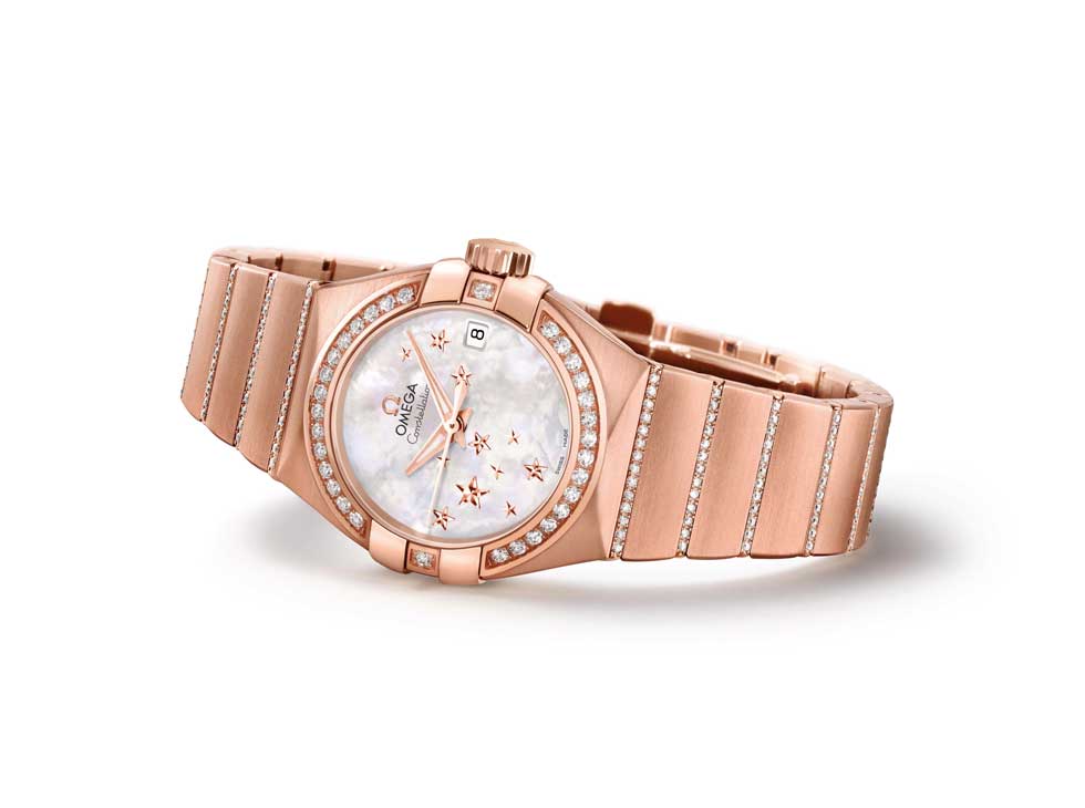 - Omega Una pieza mágica de 27 mm -realizada en oro rojo de 18 quilates- se une a la familia Constellation. Las retozonas estrellas realzan la carátula nácar del reloj al tiempo que confieren la idea de una lluvia de fuegos artificiales en perfecta comunión con los diamantes del brazalete y el bisel.