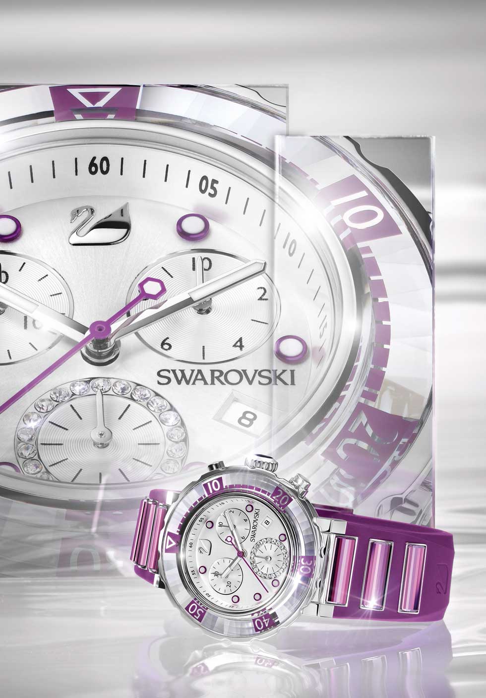 - Swarovski El círculo de cristales pavé en el segundo contador, realza la polifacética feminidad del cronógrafo. Realizado en acero inoxidable y hermético hasta 50 m, la correa de caucho fucsia adornada con seis cristales Diamond Touch Light, confieren sofisticación al novedoso Octea Chrono.