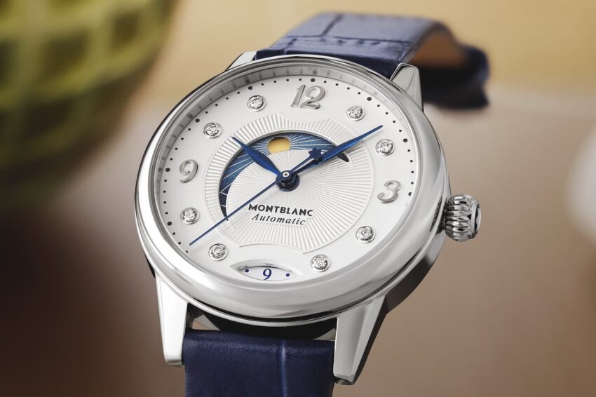 Para rendir tributo a la mujer moderna, Montblanc presenta Montblanc Bohème Day & Night de 34 mm. La carátula blanca y plateada se ha realizado con técnicas decorativas tradicionales, como el guilloché y el engaste de piedras preciosas. Cuenta con manecillas en forma de hoja, escalas de minutos con puntos elevados y un anillo de la hora interno. El diseño se realza con detalles elegantes que potencian la legibilidad, como ocho índices con diamantes grandes y números de fecha en color azul.