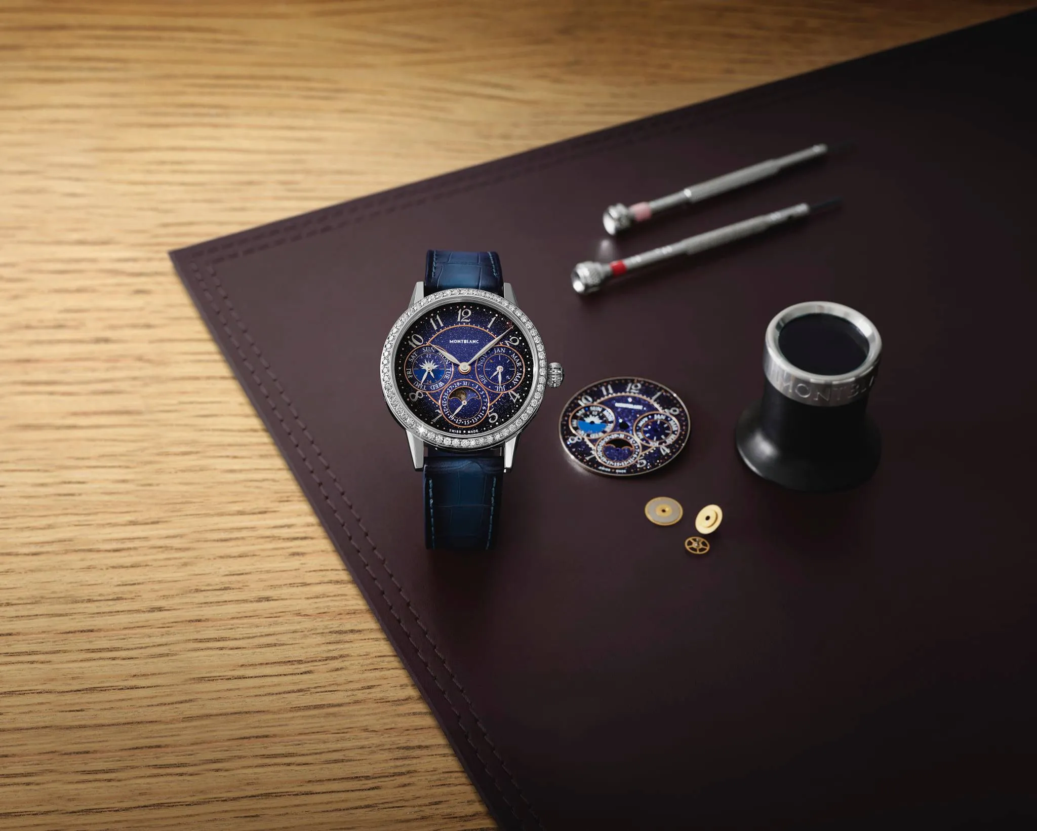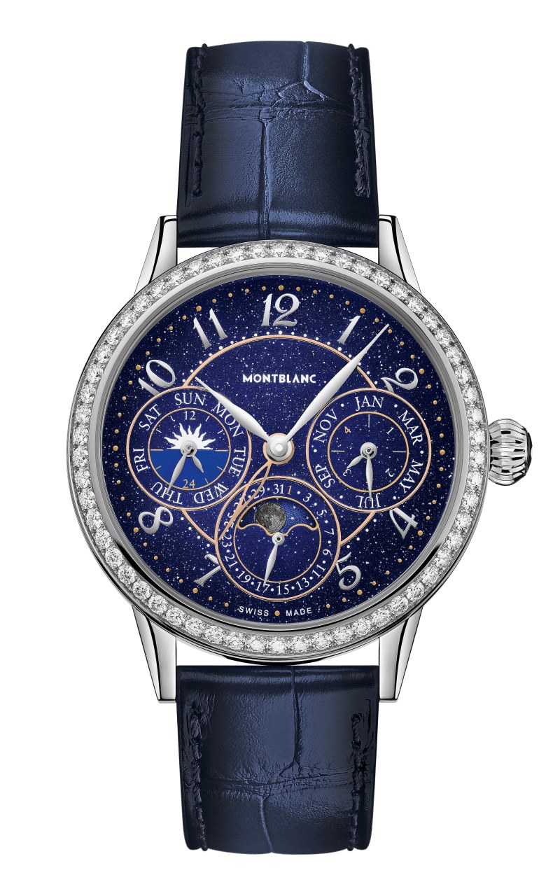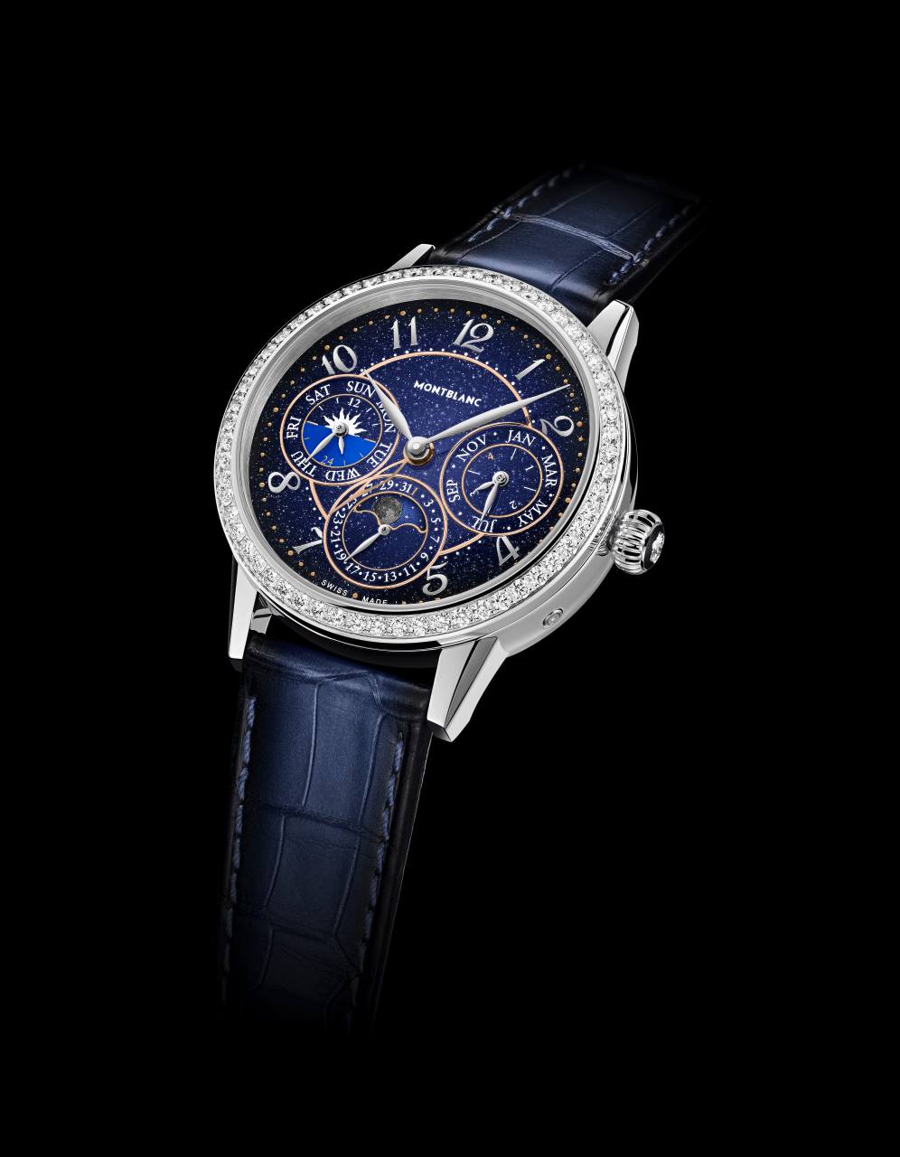 Está dotado del célebre MB 29.22, un calibre in-house que incorpora un mecanismo de calendario perpetuo patentado: indica día, fecha, mes, año bisiesto y una segunda zona horaria desde el centro, además de un indicador de 24 horas y de día y noche a las 9 horas. El calibre ofrece la posibilidad de modificar la fecha hacia delante o hacia detrás mediante la corona para ajustes rápidos de hasta un mes en menos de un minuto. Adicionalmente incluye una maravillosa complicación de fase lunar, con precisión a 122 años.