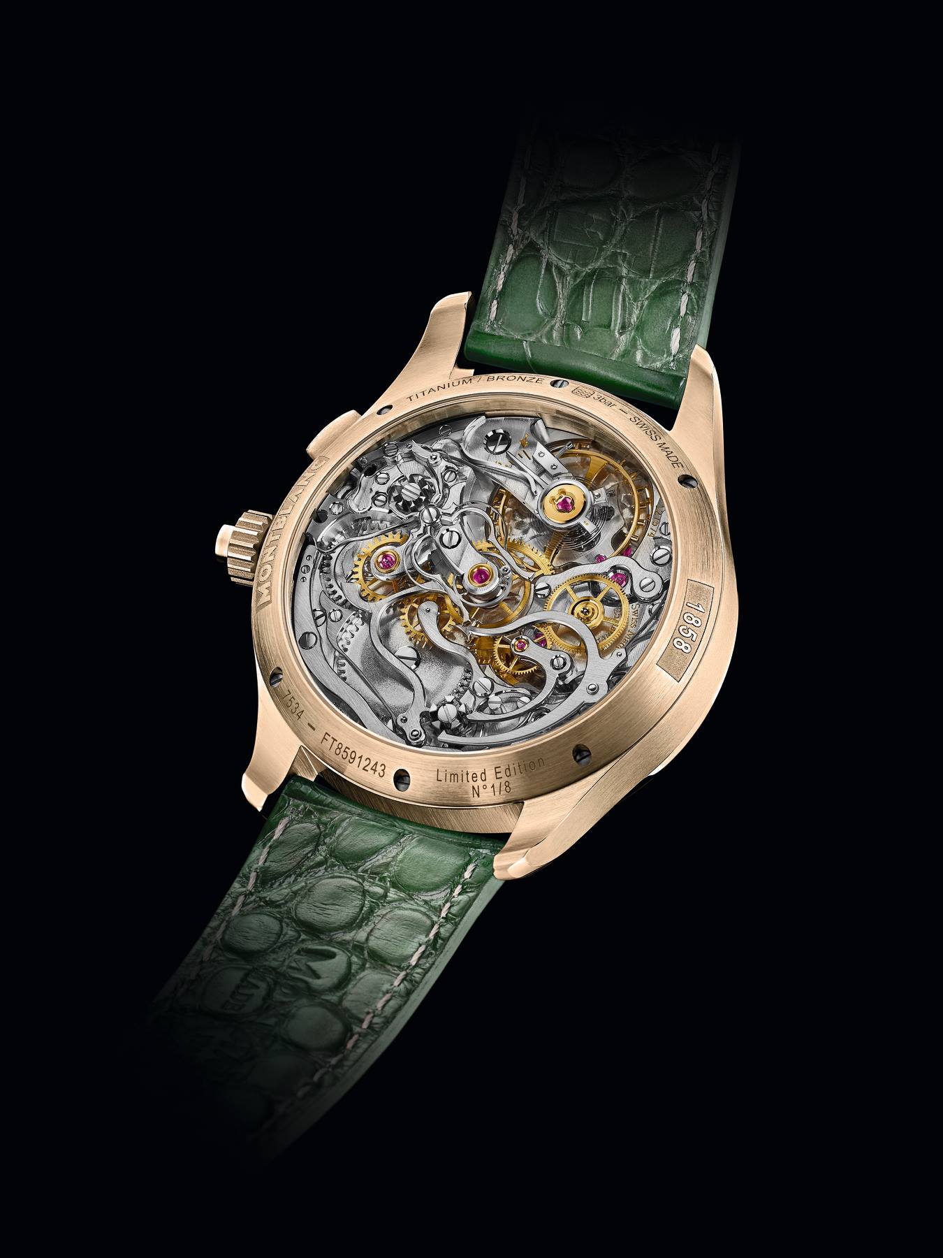 Echa mano de una carátula elaborada de jade nefrita verde para expresar el espíritu del montañismo, parte de la campaña actual de Montblanc. Pero que también fue seleccionada por la sintonía que ofrece con la bandera tricolor. Además, la caja de bronce de 44 mm de diámetro, ofrece la posibilidad de convertirse en historia viva de su portador. Ya que este metal adquirirá una pátina única según los hábitos del propietario.