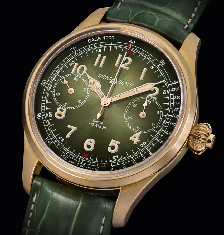 La caja se extiende hasta los 44 mm y está construida en bronce, luciendo un cristal de zafiro como fondo a fin de exhibir la belleza del movimiento, mientras que en esta ocasión destaca el color de la carátula en verde olivo destacada por un acabado soleil que juega con diferentes tonalidades de la misma haciéndola lucir aún más vintage. Se abraza al pulso mediante una correa de piel de cocodrilo a juego. La pieza está dotada por el certificado de precisión y confiabilidad Montblanc Performance Test 500. Finaliza con un grabado que le certifica como pieza única.