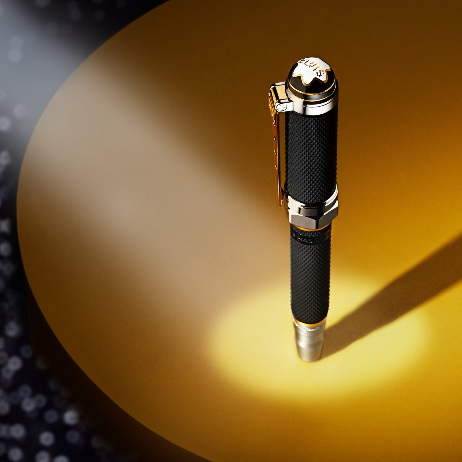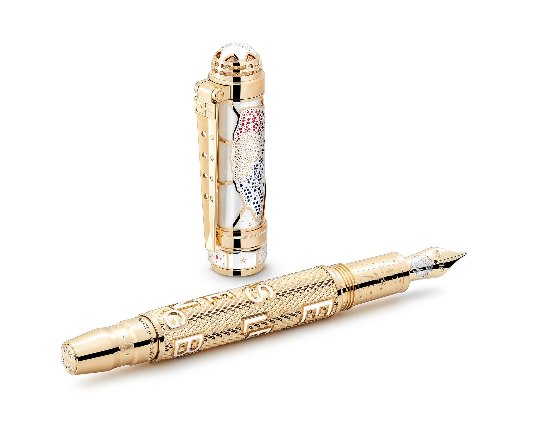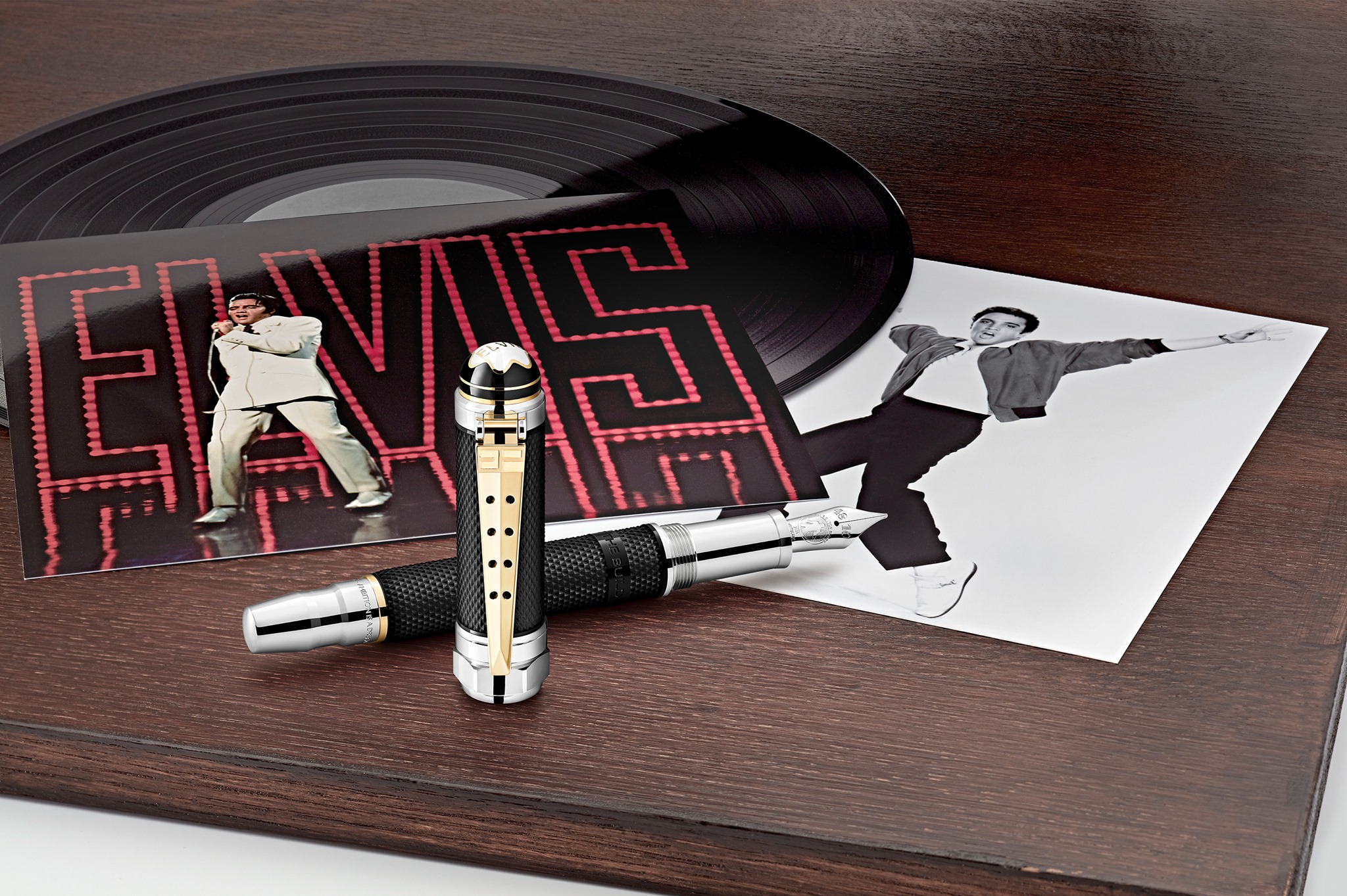 La pluma también muestra una textura romboide en el capuchón inspirada en el anillo dorado que Elvis utilizó en el concierto Aloha from Hawaii, mientras que el clip en plaqué oro evoca el amor de Elvis por los motores V8. Finalmente, el plumín de oro Au 585 está grabado con el título de la canción Blue Suade Shoes, compuesta por Carl Perkins y éxito de Elvis en 1956.