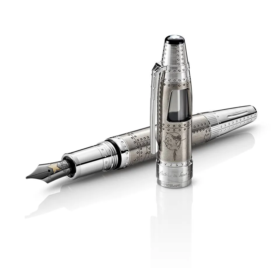 La forma del artículo evoca a su avión Caudron Simoun, pues luce en el cuerpo un color metal que rememora los remaches de la aeronave. Por su parte, la cabina del piloto de su avión inspira para la creación de un capuchón esqueletado. Otros detalles destacan la posición geográfica de las ciudades que fueron parte de la vida de Antoine Marie Jean-Baptiste Roger Vicomte de Saint-Exupéry, su nombre completo. Coronando la obra, en el plumín, de oro con revestimiento de platino, se hace referencia a la emblemática estrella citada en El Principito.