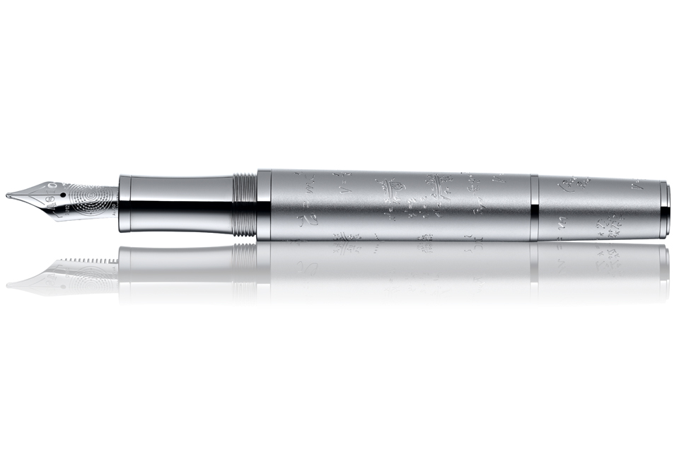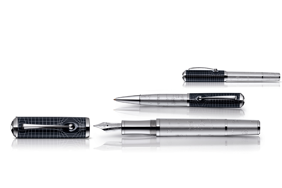 La fórmula que cambió el mundo: E = mc2, que describe la equivalencia de la materia y la energía, sigue siendo un hito en la física moderna, especialmente la ciencia nuclear, aparece grabada en el plumín que, además incorpora un elemento que lleva su nombre: einstenio, mientras que la laca de color azul oscuro de la tapa trae a la mente la oscuridad aterciopelada del universo infinito. La rejilla de la tapa está inspirada en la teoría general de la relatividad de Einstein. Finalmente, el cuerpo y el cono están grabados con las fórmulas más importantes de Einstein.