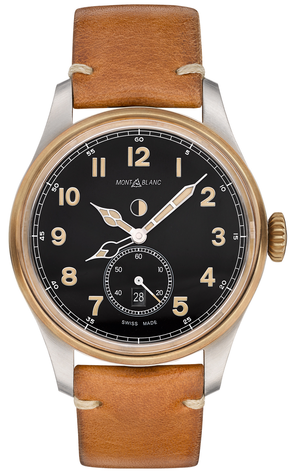 Ideal para admirar las horas y minutos con calibre mecánico automático (MB 24.16) dotado de 38 horas de autonomía a 4 Hz. Su caja de acero se extiende hasta los 44 mm, mientras que luce un bisel hecho de bronce, material que se replica en la corona y que adoptará una patina decididamente personal. La carátula negra con números árabes revestidos de SuperLumiNova® beige, contrastarán de manera ideal logrando ese estilo clásico que tanto nos encanta. Se abraza mediante una correa de piel de becerro con hebilla de acero satinado.