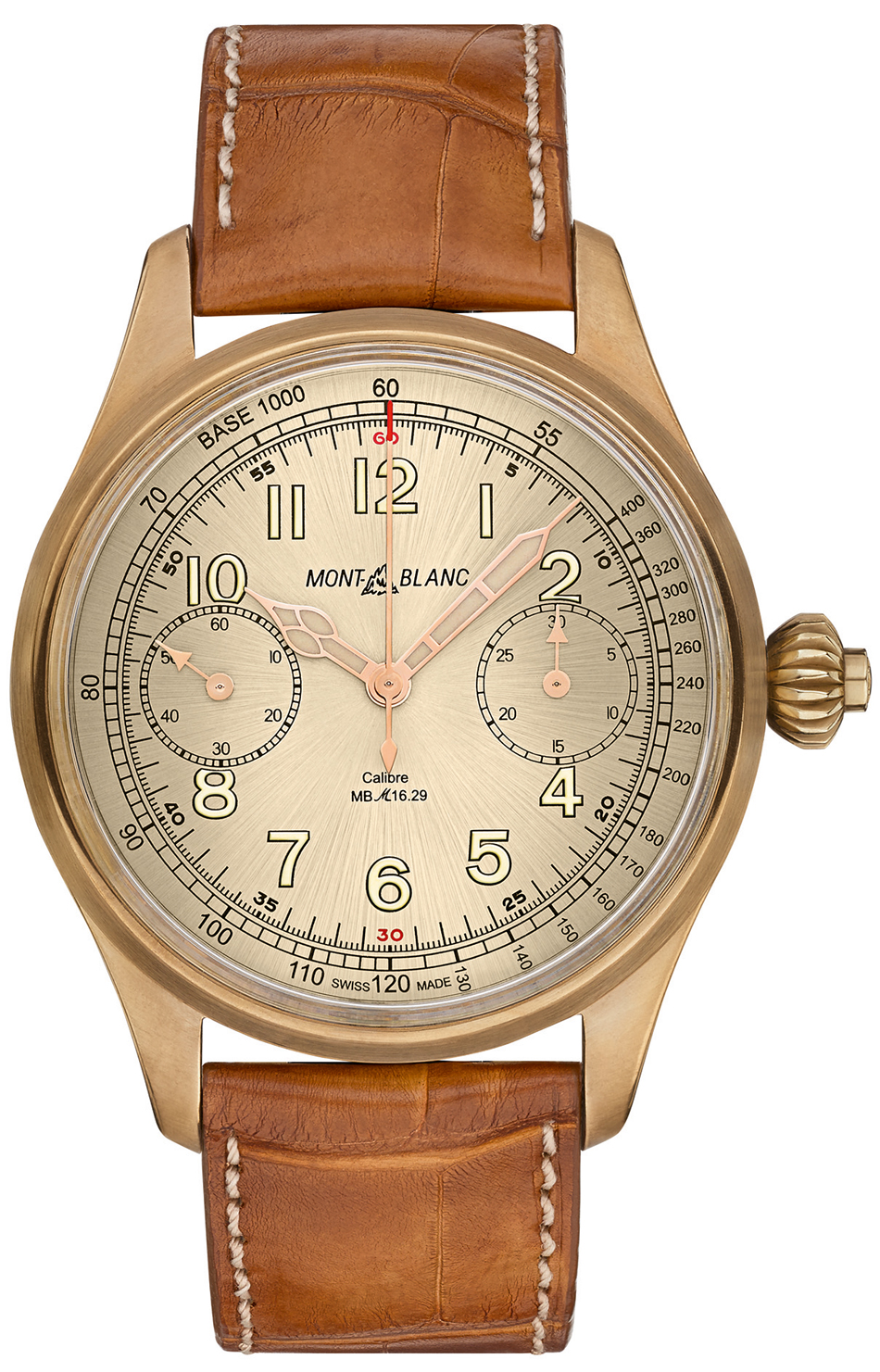 al interior late el calibre cronógrafo monopulsante de Manufactura MB M16.29, que goza de una construcción con rueda de pilares y embrague horizontal para la fácil manipulación del crono. Posee autonomía por 50 horas y late a 2.5 Hz. Adicionalmente cuenta con puentes de plata alemana enchapada en oro rosa, brazos facetados enchapados en oro y superficies pulidas con diamante. Este calibre es producto de los diestros relojeros y artesanos del atelier de Montblanc en Villeret. La caja se extiende hasta los 44 mm y está construida en bronce, luciendo un cristal de zafiro como fondo a fin de exhibir la belleza del movimiento. El monopulsador se manipula desde la corona, y el conjunto posee la certificación Montblanc Performance Test 500, y está limitado a 100 ejemplares.