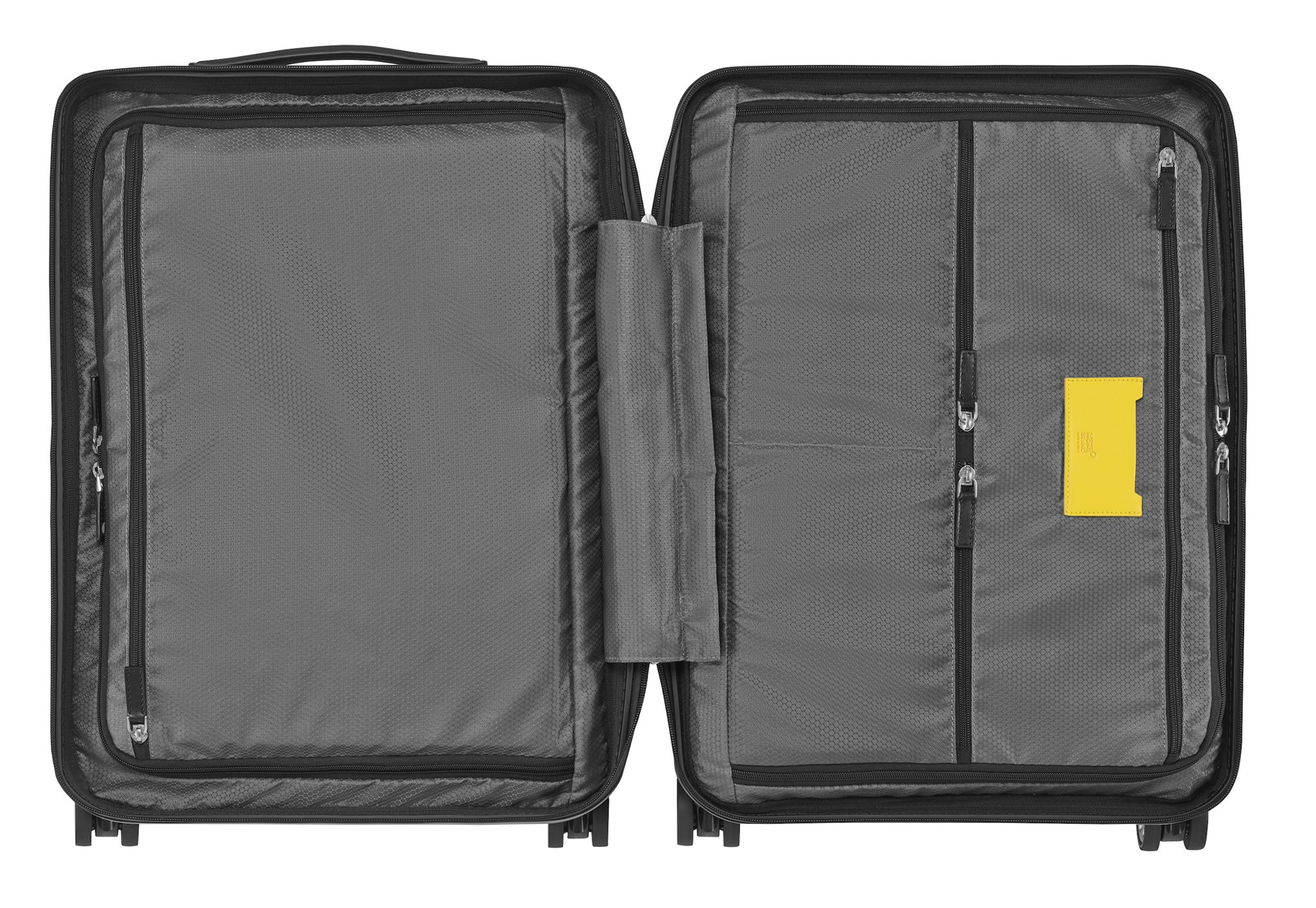 - El motivo de la banda de rodamiento de la P Zero de Pirelli grabado en las etiquetas de equipaje amarillas y negras y en los detalles de piel del trolley.