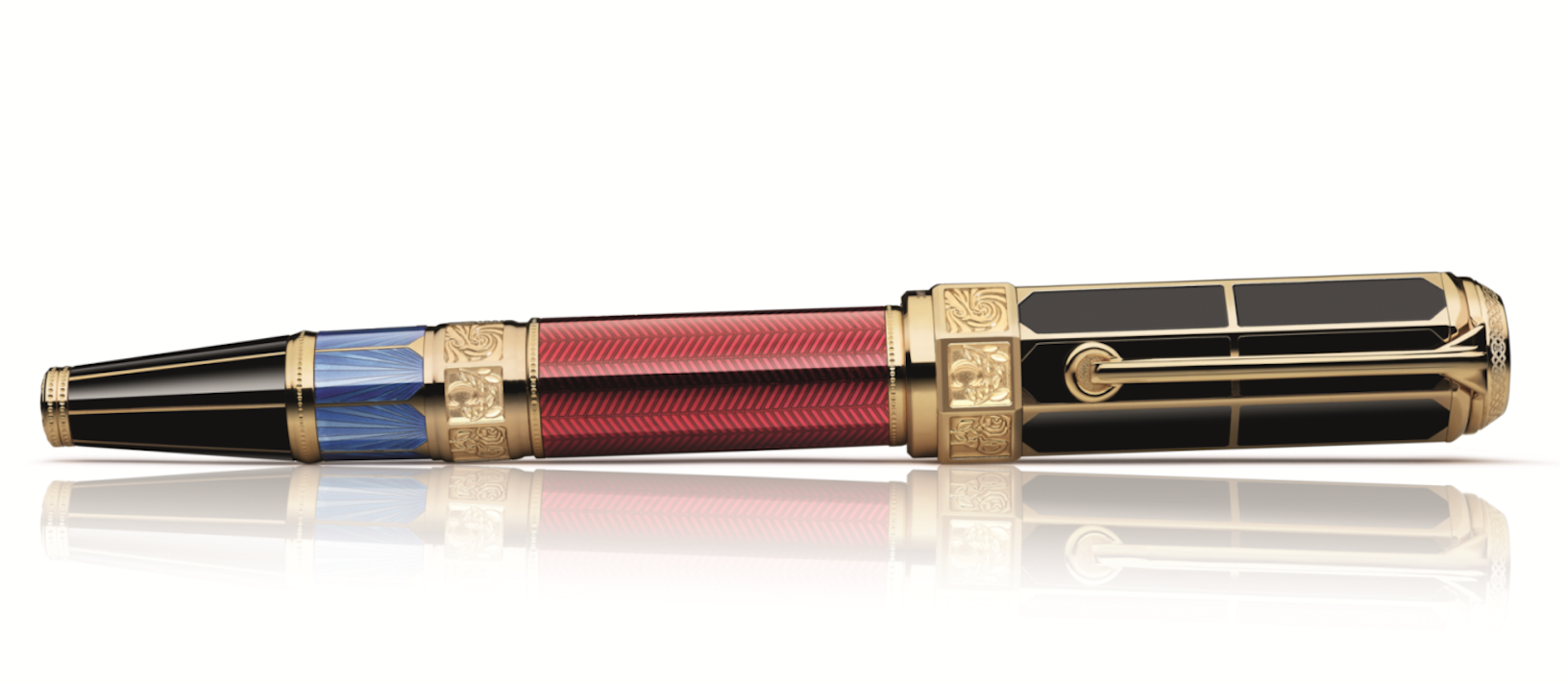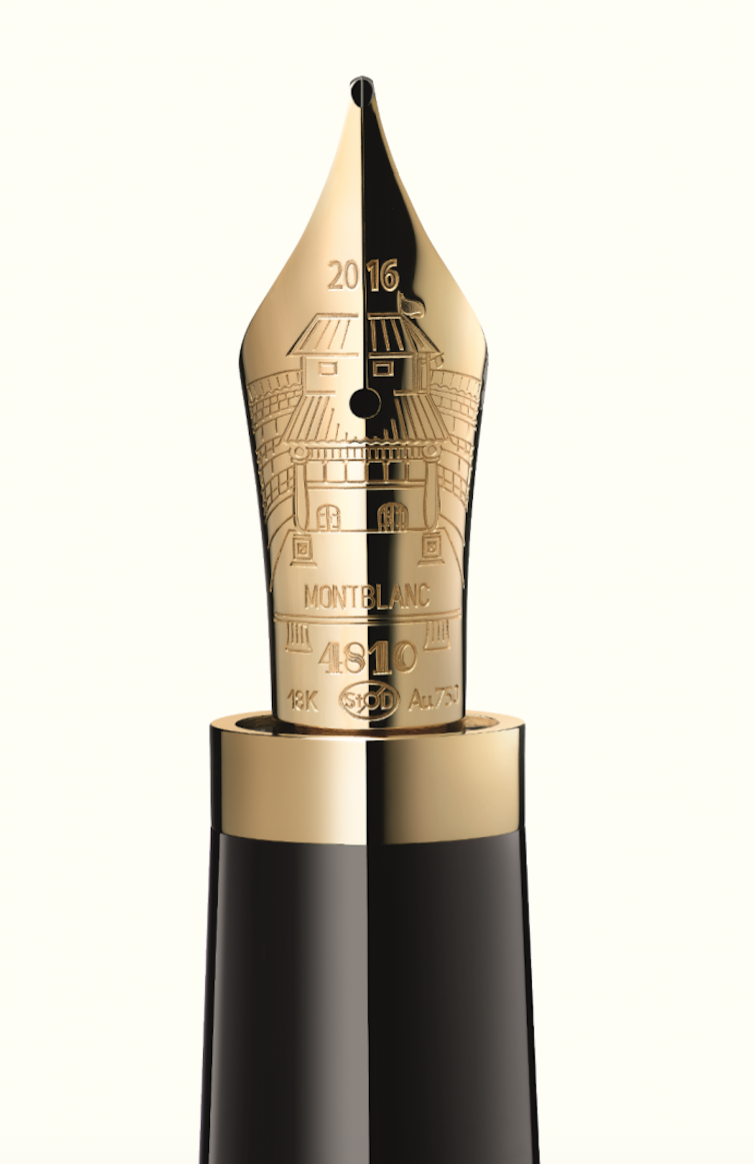 El plumín de oro muestra el emblema de Montblanc grabado en la corona, mismo que rinde homenaje al Globe Theatre.