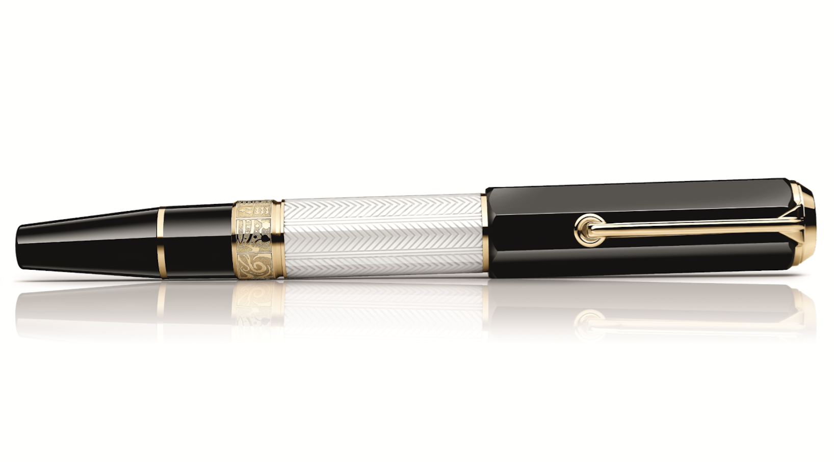 Hoy, las tragedias y las novelas románticas podrán ser escritas por las estilográficas creadas a partir de los materiales más exclusivos del planeta, y moldeadas por los maestros artesanos altamente calificados. El capuchón –hecho de resina preciosa– evoca al famoso Globe Theater y a su estructura octagonal, que con los detalles y bordes no pierden la superficie pulida. La combinación blanca y negra de resina presente en el capuchón evoca a los colores de las banderas izadas del teatro, en donde el blanco representaba la comedia y el negro a la tragedia.