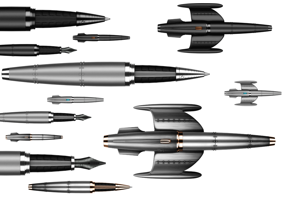 La elocuente invitación para escapar de la realidad terrenal fue interpretada en tres diferentes versiones: Heavy Metal, Black Metal y Vintage, disponibles en pluma fuente con punta de titanio o bolígrafo.