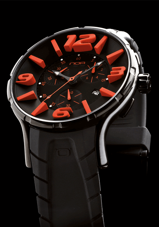 La colección más representativa de N.O.A. hasta el día de hoy, muestra su carácter audaz y contemporáneo y lo manifiesta en la gama de colores que utiliza en sus piezas, así como en los índices y las cifras romanas sobredimensionados sobre el realce, cuyo atrevido naranja contrasta con el negro más posado de la carátula.