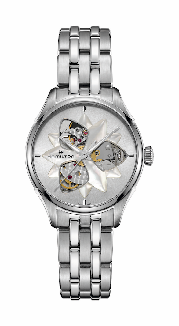 Su carátula abierta con borde biselado cortado con diamante se mezcla con una flor de loto tridimensional elaborada en nácar.