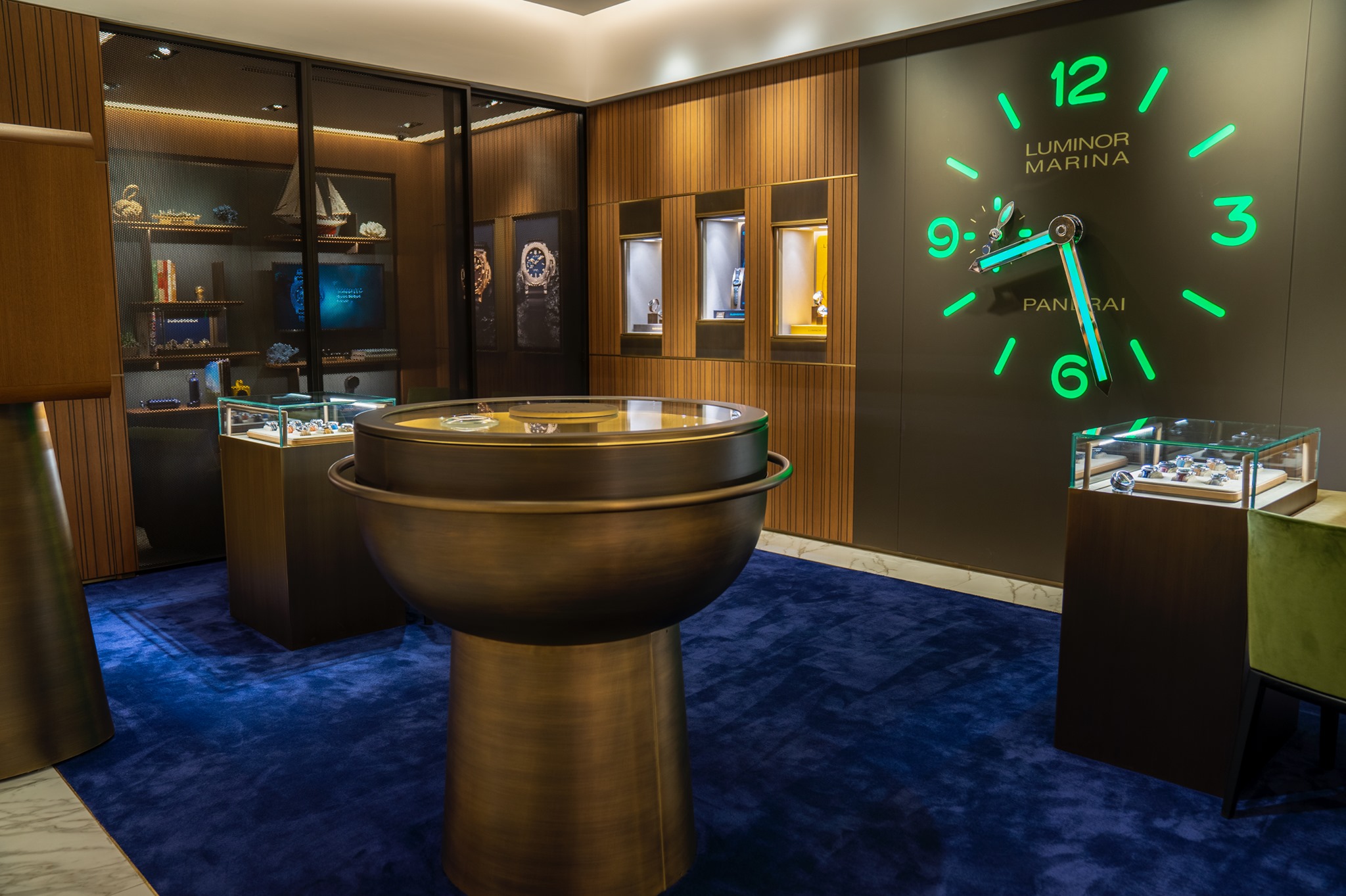 Los detalles acuáticos como submarinos, embarcaciones de vela y demás, destacan como parte de los detalles. Mientras que en sus vitrinas se ofrecerá la más extensa selección de relojes pertenecientes a todas sus colecciones: Submersible, Luminor, Luminor Due y Radiomir. Además de que habrán de llegar algunas piezas de alta complicación dentro del nombre Lo Scienziato.