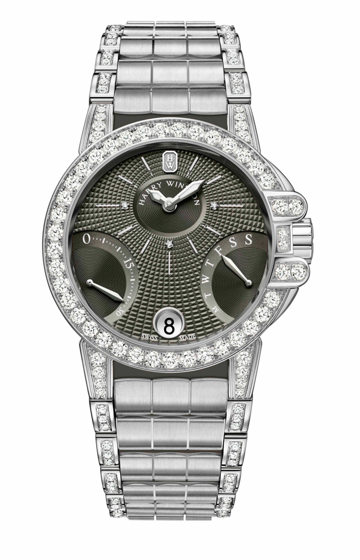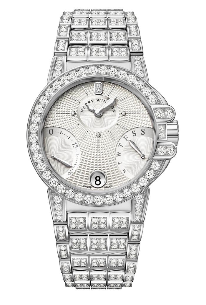 - HARRY WINSTON Ocean Biretrograde // Movimiento: mecánico automático / Calibre: HW1029 de manufactura / Caja: 36 mm de oro blanco de 18 quilates engastada con diamantes / Cristal: zafiro por ambos lados / Carátula: color gris pizarra engastada con diamantes / Funciones: horas, minutos y segundos; fechador con días retrógrados / Brazalete: oro blanco de 18 quilates / Frecuencia 28,800 a/h / Reserva de marcha: 42 h / Hermeticidad: 100 metros.