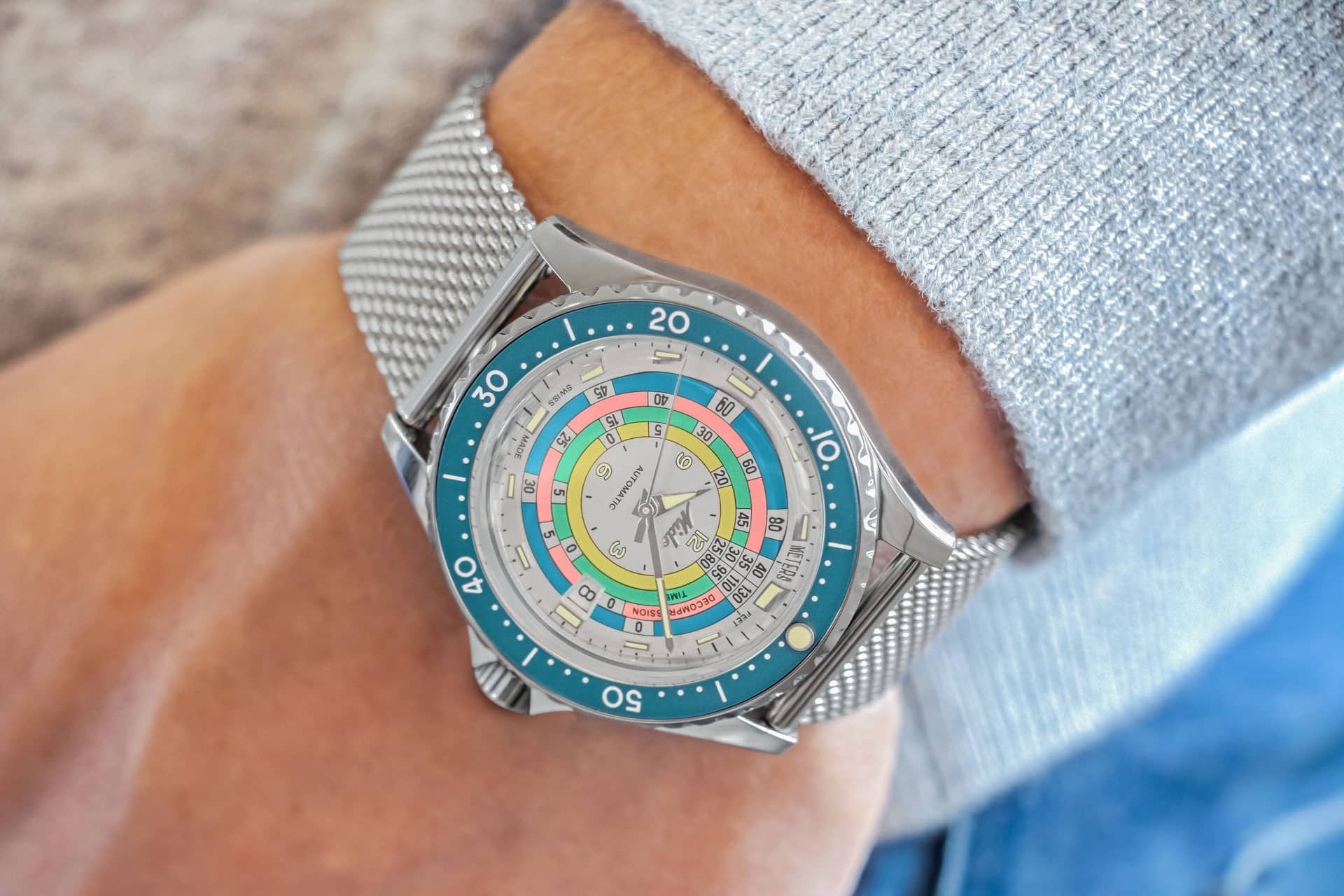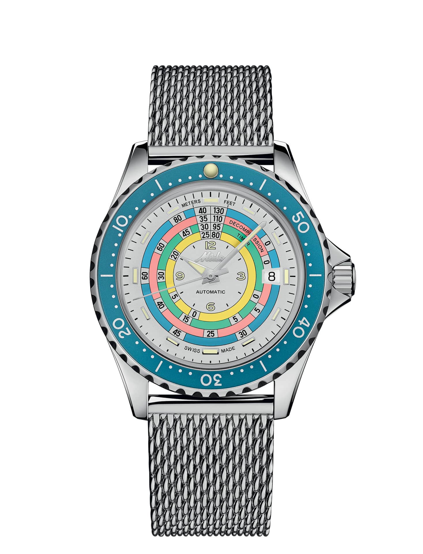 El objetivo de Mido fue facilitar la medición de los tiempos. Por ello, éstos se mostraban en círculos de colores contrastantes: amarillo para una profundidad de buceo de 25 a 29 metros, verde para 30 a 34 metros, rosa para 35 a 39 metros y azul para 40 a 44 metros. Al colocar el minutero a las 12 en punto antes de una inmersión, el usuario podría leer la información en la mesa durante la inmersión. El bisel giratorio permitió calcular el tiempo de inmersión o las paradas de descompresión.