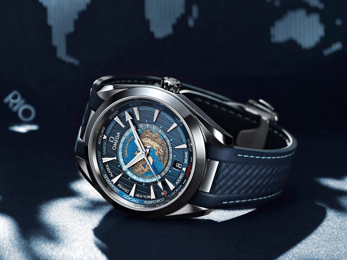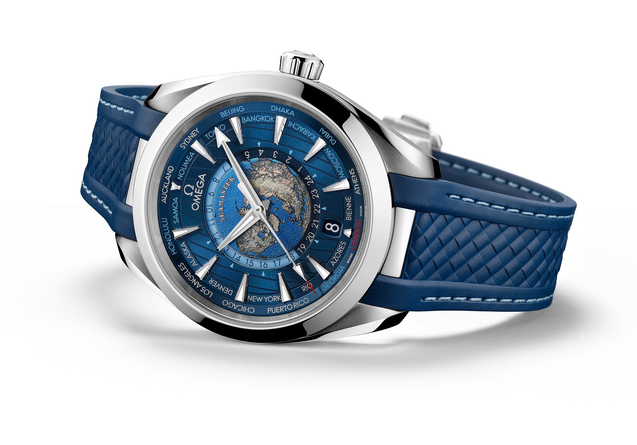 Esta pieza Worldtimer ha tenido éxito y popularidad a nivel mundial. La exquisita artesanía y la atención al detalle ahora continúan en una nueva selección de modelos que incluyen una tecnología aún más impresionante. La caja de 43 mm cepillada y pulida está hecha de acero inoxidable y ahora se ha integrado con la correa de caucho azul del reloj a través de un eslabón pulido sólido. Esto recuerda al estilo de la colección principal de Aqua Terra de la marca. La carátula azul cepillada incluye rayas verticales de teca del Aqua Terra, así como un nuevo anillo interior. La carátula está rodeada por un círculo de destinos globales y, para un toque especial, incluyen la ciudad de Bienne en GMT + 1, la casa de Omega en Suiza.