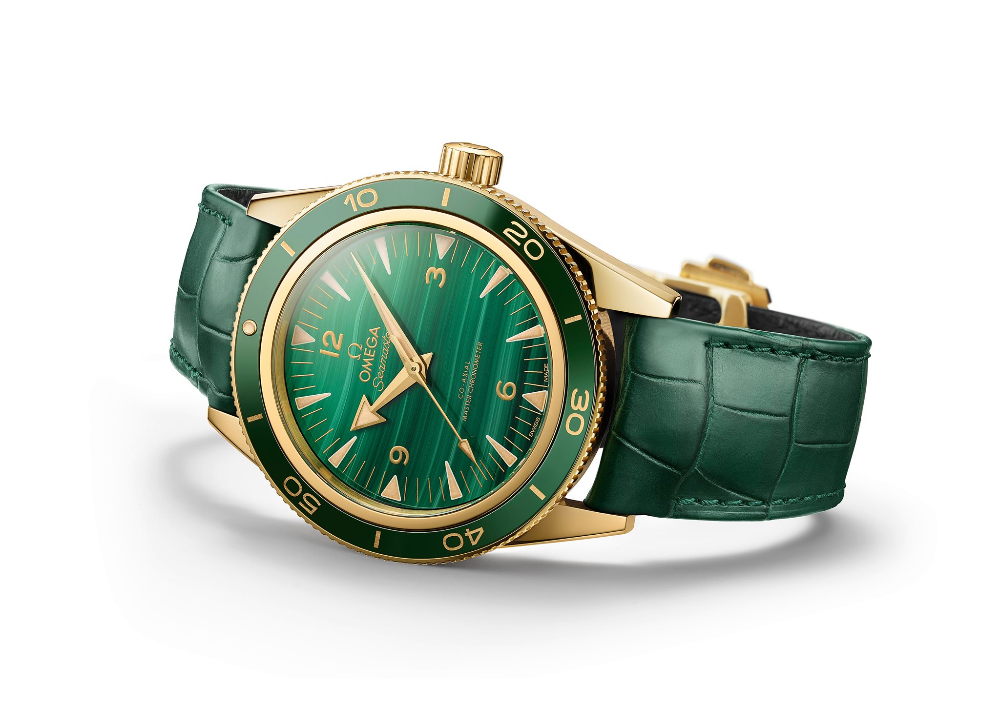 Se ha apreciado desde la antigüedad y se ha utilizado ampliamente en la decoración de templos sagrados, palacios e iglesias. Para el dial de este reloj, Omega ha obtenido la malaquita más cautivadora de Sudáfrica. Para esta pieza la caja está desarrollada en 41 mm de oro amarillo para la caja, mientras que el bisel es de cerámica pulida y la escala está hecha en Ceragold™. El reloj se presenta en una correa de piel de becerro verde y está impulsado por el Cronómetro maestro CoAxial Calibre 8913. El movimiento y el reloj completo han sido certificados oficialmente por el Instituto Federal de Metrología de Suiza (METAS).