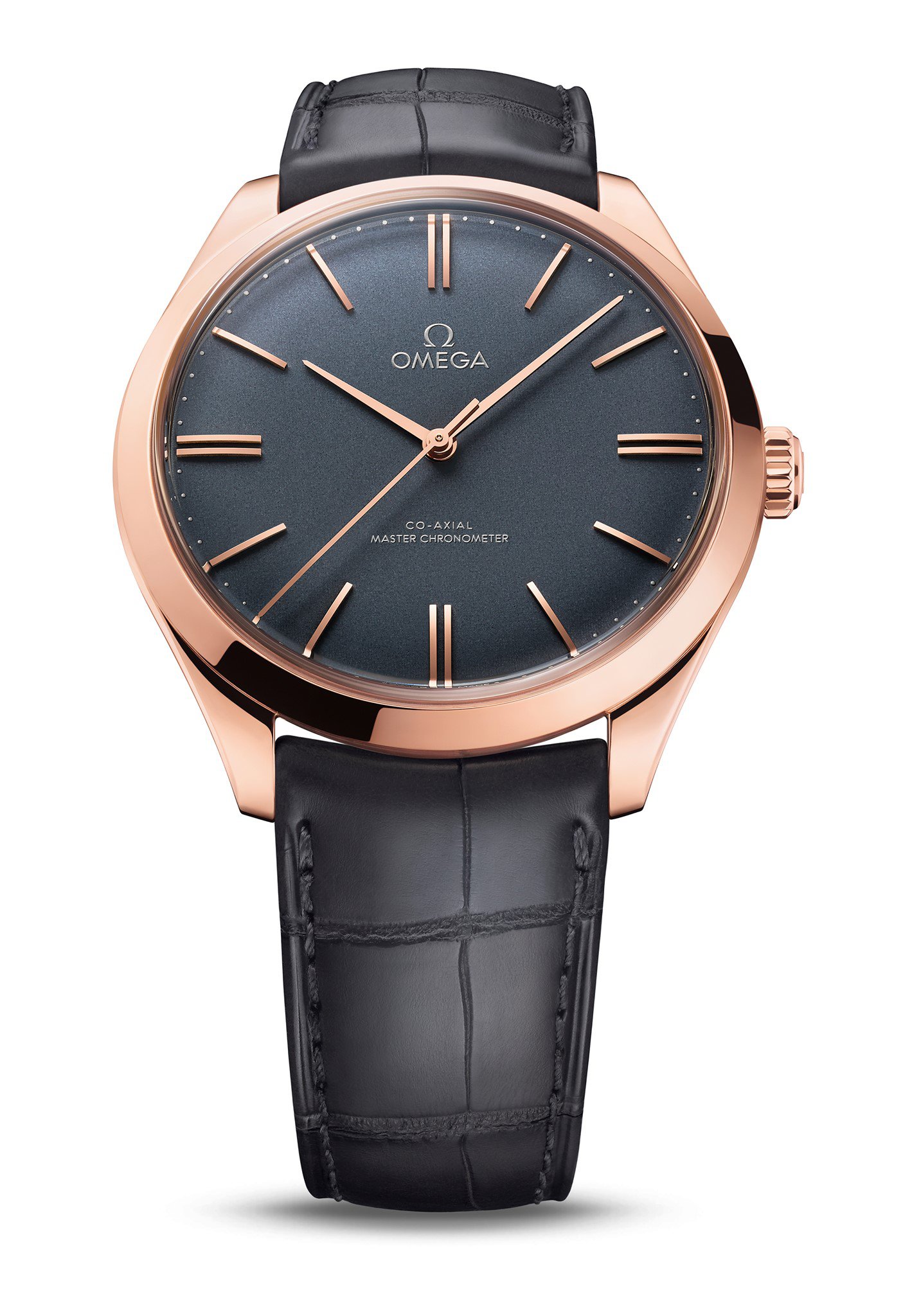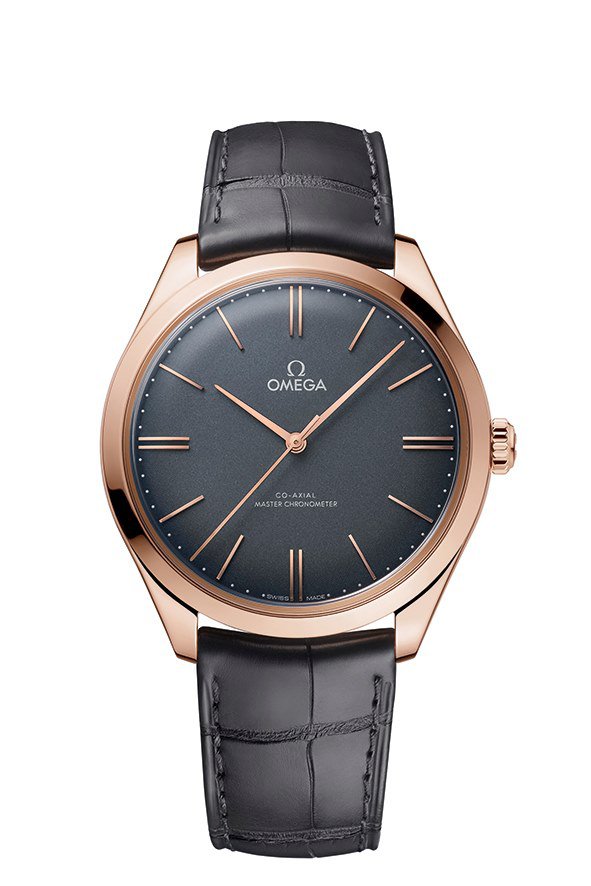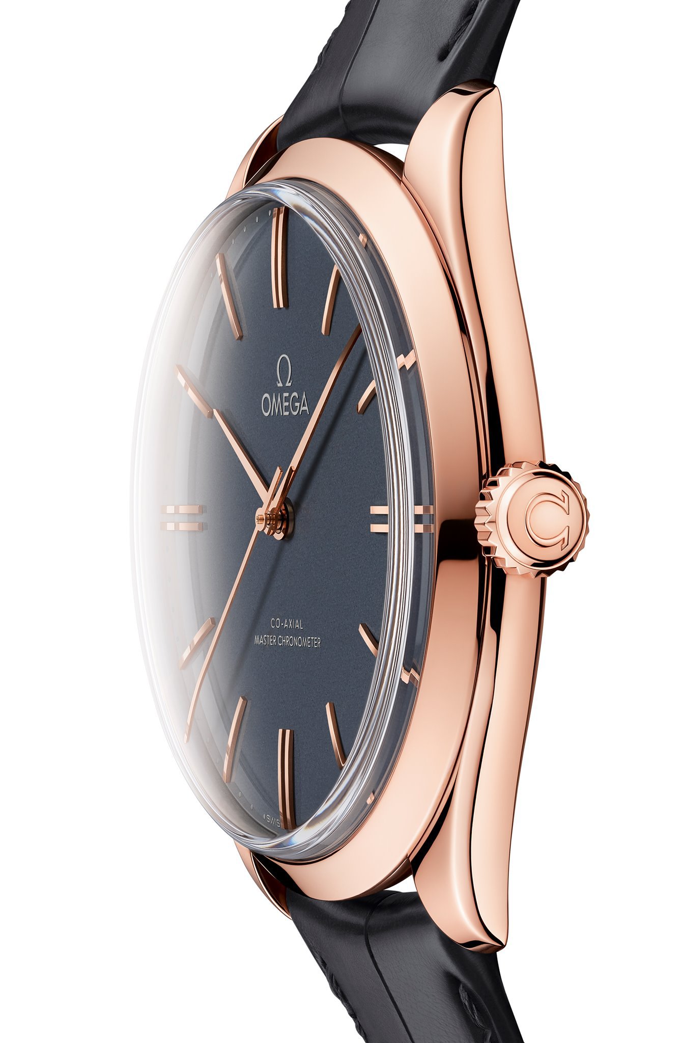 Dos carátulas distintas se ofrecen, incluida una zona central barnizada en gris y un sector ennegrecido exterior. 18K Moonshine™ se usa para los índices biselados, el logotipo Omega se presenta en todas las agujas, excepto el segundero central del cronógrafo, que está “tratado con PVD” en Moonshine.