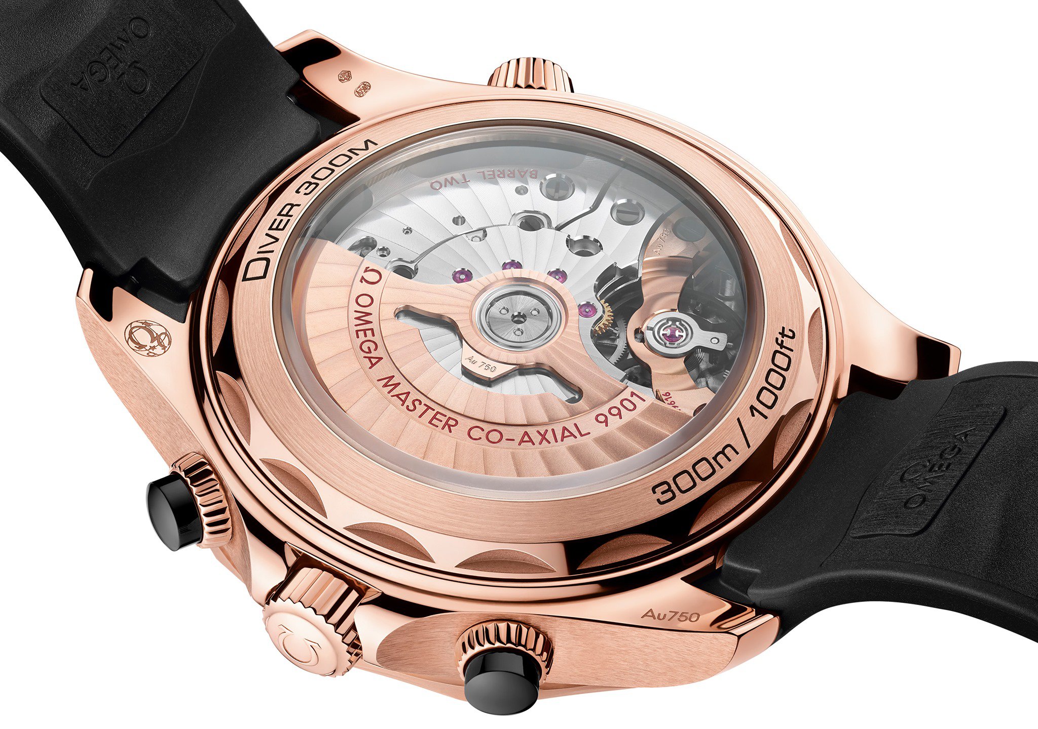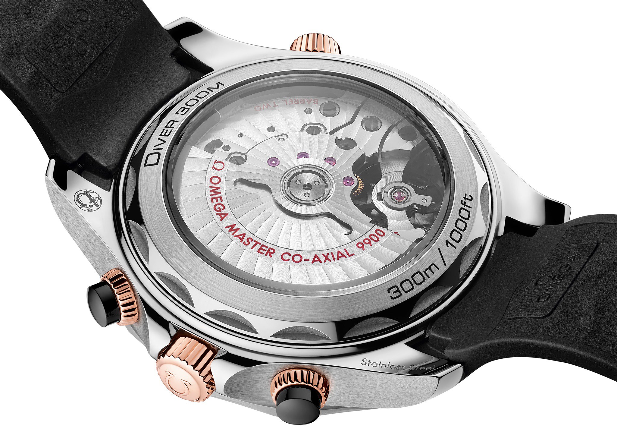 A través del fondo de cristal de zafiro, los usuarios pueden ver el cronómetro maestro coaxial Omega Calibre 9900. El Instituto Federal de Metrología de Suiza (METAS) ha certificado oficialmente el movimiento y el reloj completo.