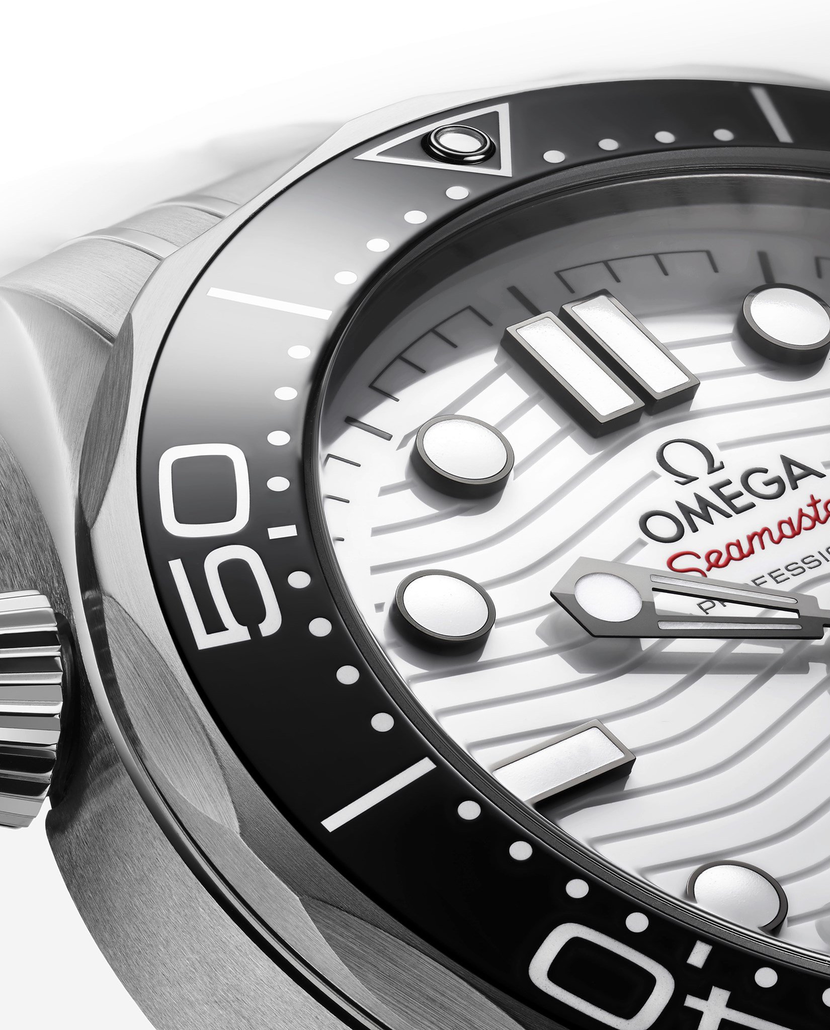 La carátula de cerámica azul está grabada con láser con las icónicas ondas Diver 300M. Incluye una ventana de fecha a las 6 en punto, así como índices elevados que se llenan con Super-LumiNova. Todas las manos están chapadas en rodio.