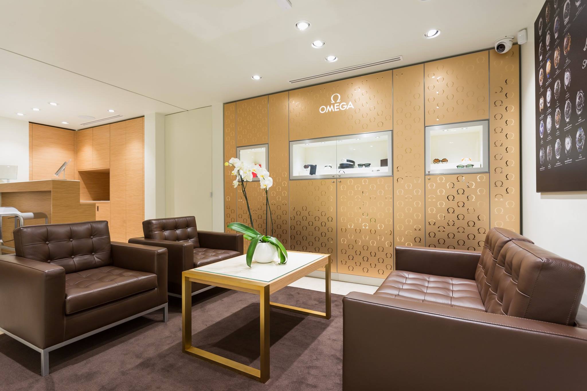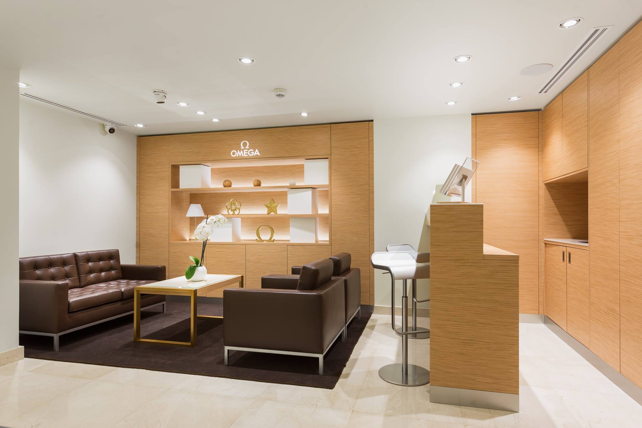 Está caracterizada por elementos de diseño que se inspiran en exhibir las temáticas de la tierra, el agua y el tiempo. El uso de cristal y los muebles de madera con un estilo cebra se complementan con una selección de atractiva piel para destacar la elegancia de los relojes. Esta atmósfera íntima y lujosa brinda a los visitantes la oportunidad de apreciar la extensa línea de relojería organizada dentro de las colecciones: Seamaster, Constellation, Speedmaster y De Ville.