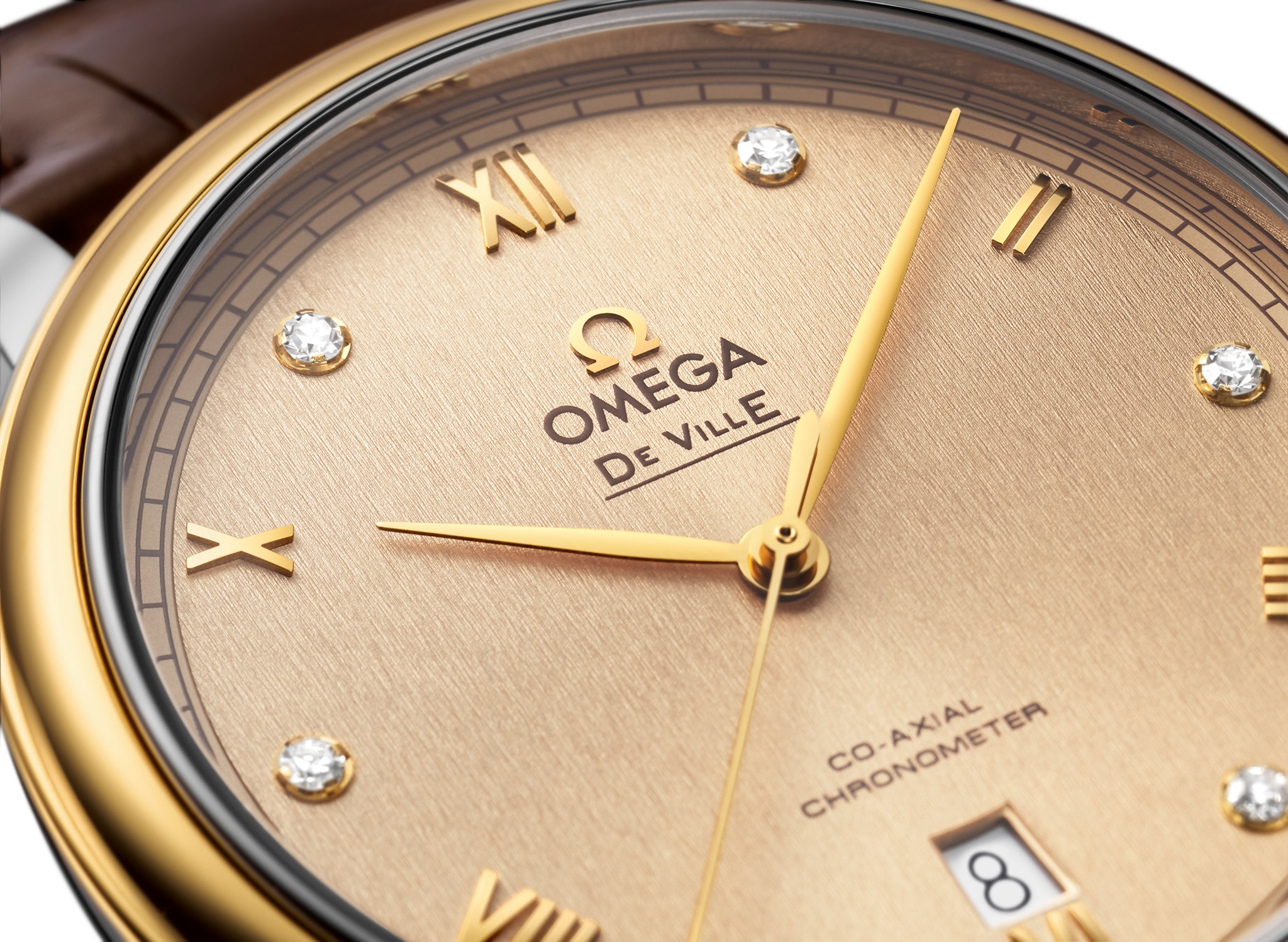 Común a casi todos los relojes de la colección es la carátula bellamente sobria, ofrece una pista de minutos en forma de ferrocarril, y la ventana de fecha a las 6 en punto con el logotipo Omega aplicado, y números romanos y cabujones alternados.