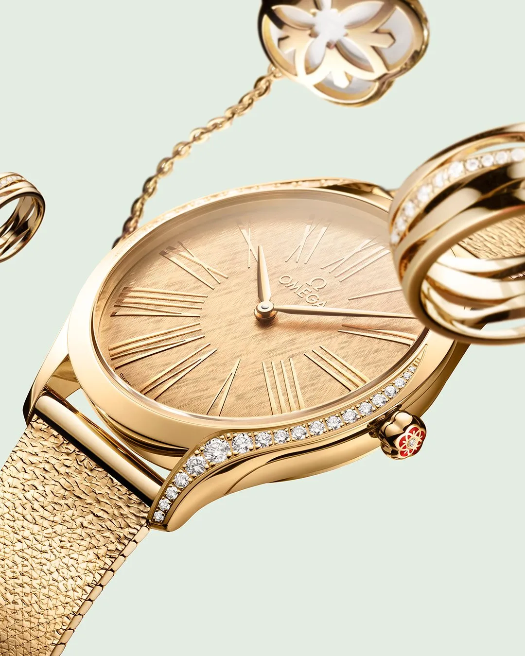 Con 36 mm de diámetro, la estructura de Moonshine Gold –aleación de oro de 18 quilates patentada por Omega–, exhibe un diseño elegante y encantador que jamás pasará desapercibido. La carátula también es de oro Moonshine y presenta un patrón similar a la seda con agujas pulidas y números romanos. Adicionalmente, la corona destaca mediante un diseño floral en cerámica líquida roja hecha a partir de los logotipos de Omega, y un diamante en solitario.