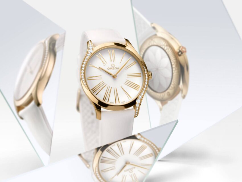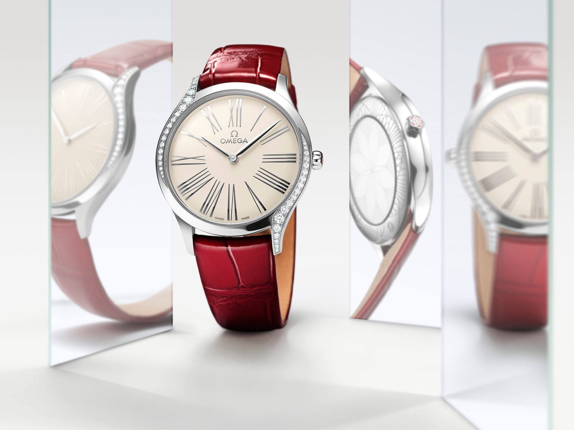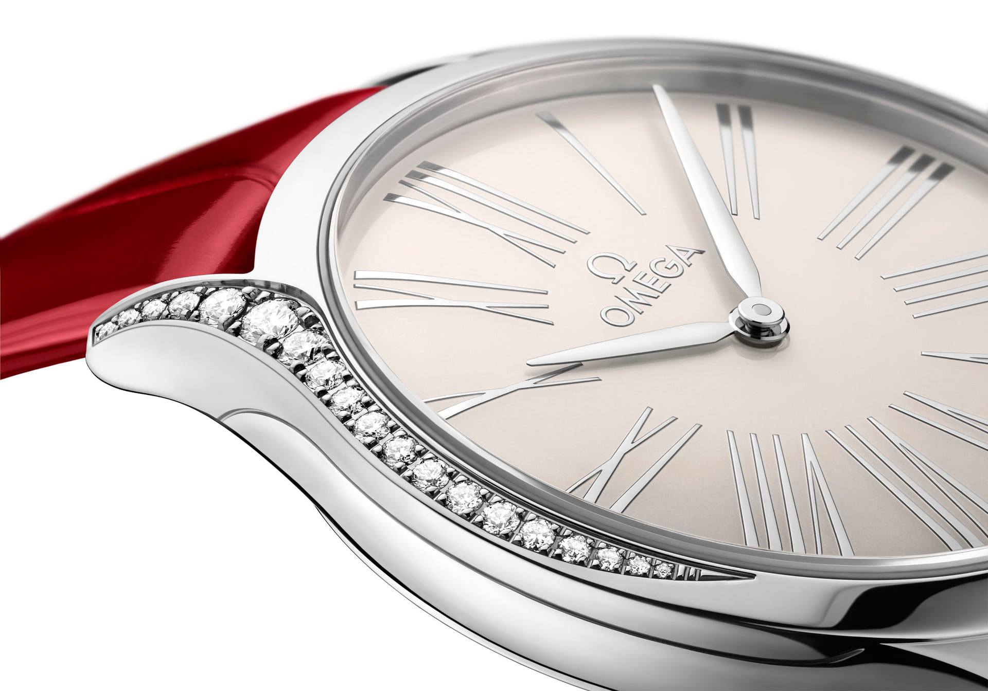 De acuerdo con el diseño distintivo de Trésor, cada caja está adornada con 38 diamantes, que se curvan a lo largo de los lados de la caja. También se coloca un diamante adicional en cada corona, en medio de una flor Omega de cerámica líquida roja. Además, los relojes destacan por sus fondos de caja de espejo bellamente pulidos, cada uno adornado con un patrón metalizado “Her Time”.