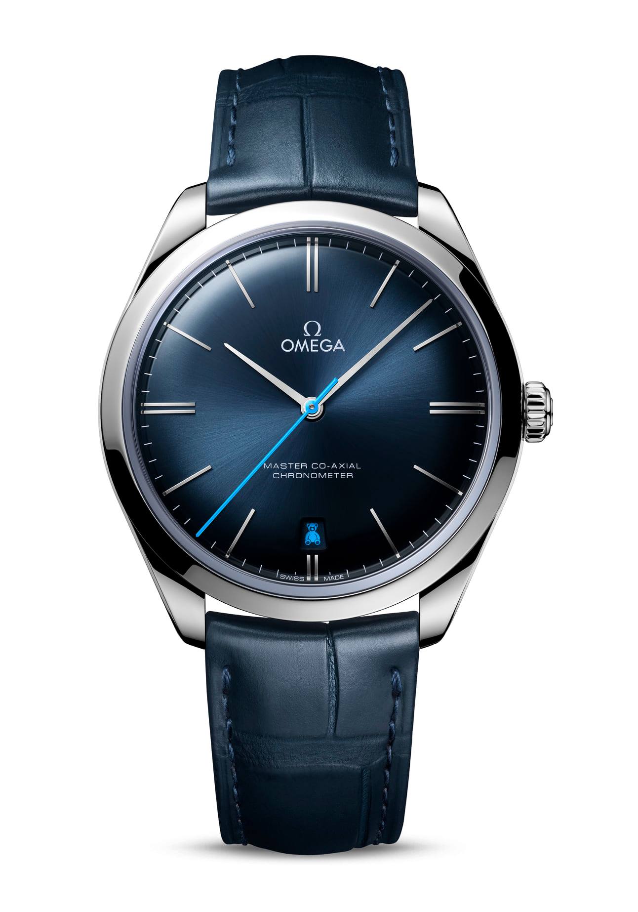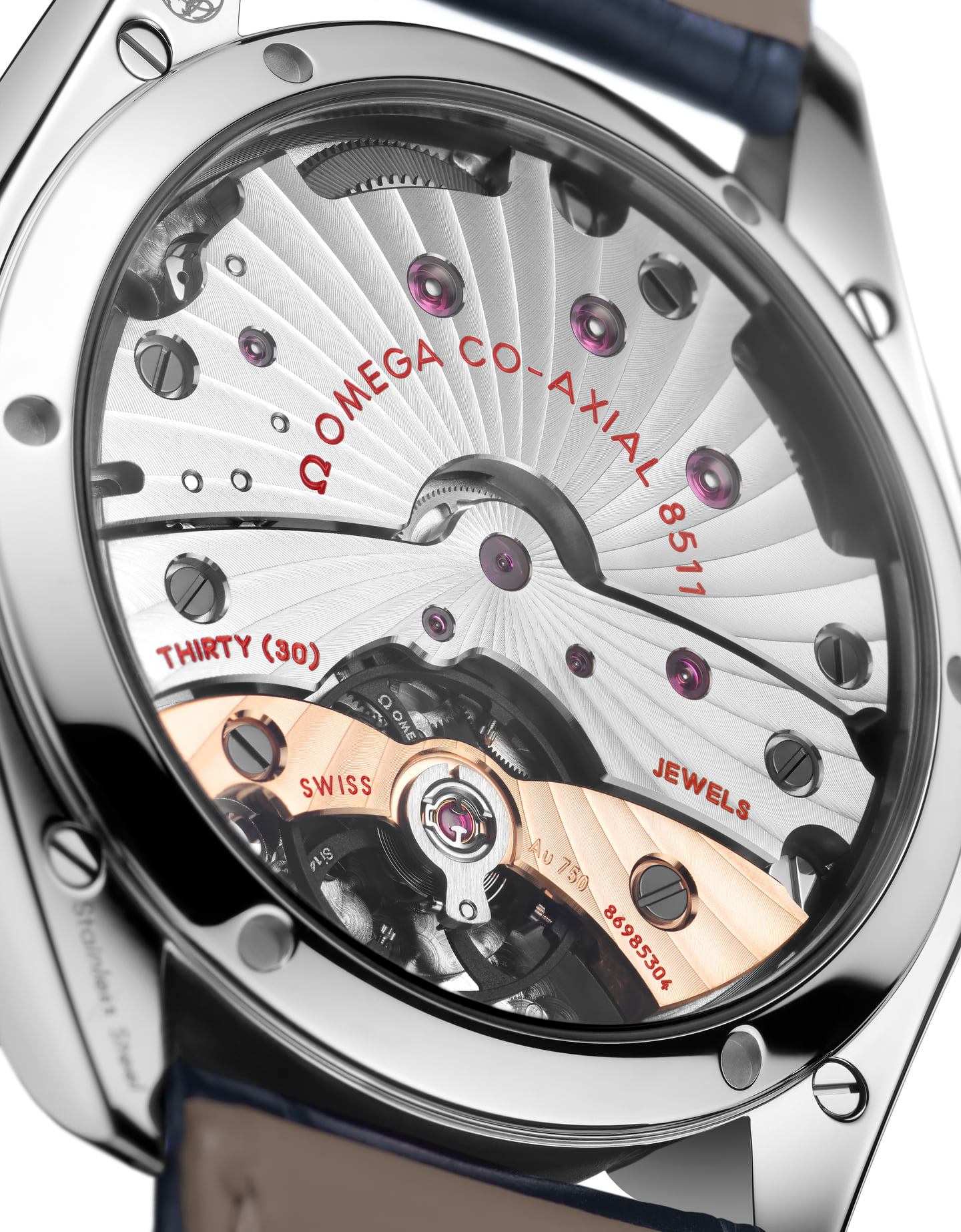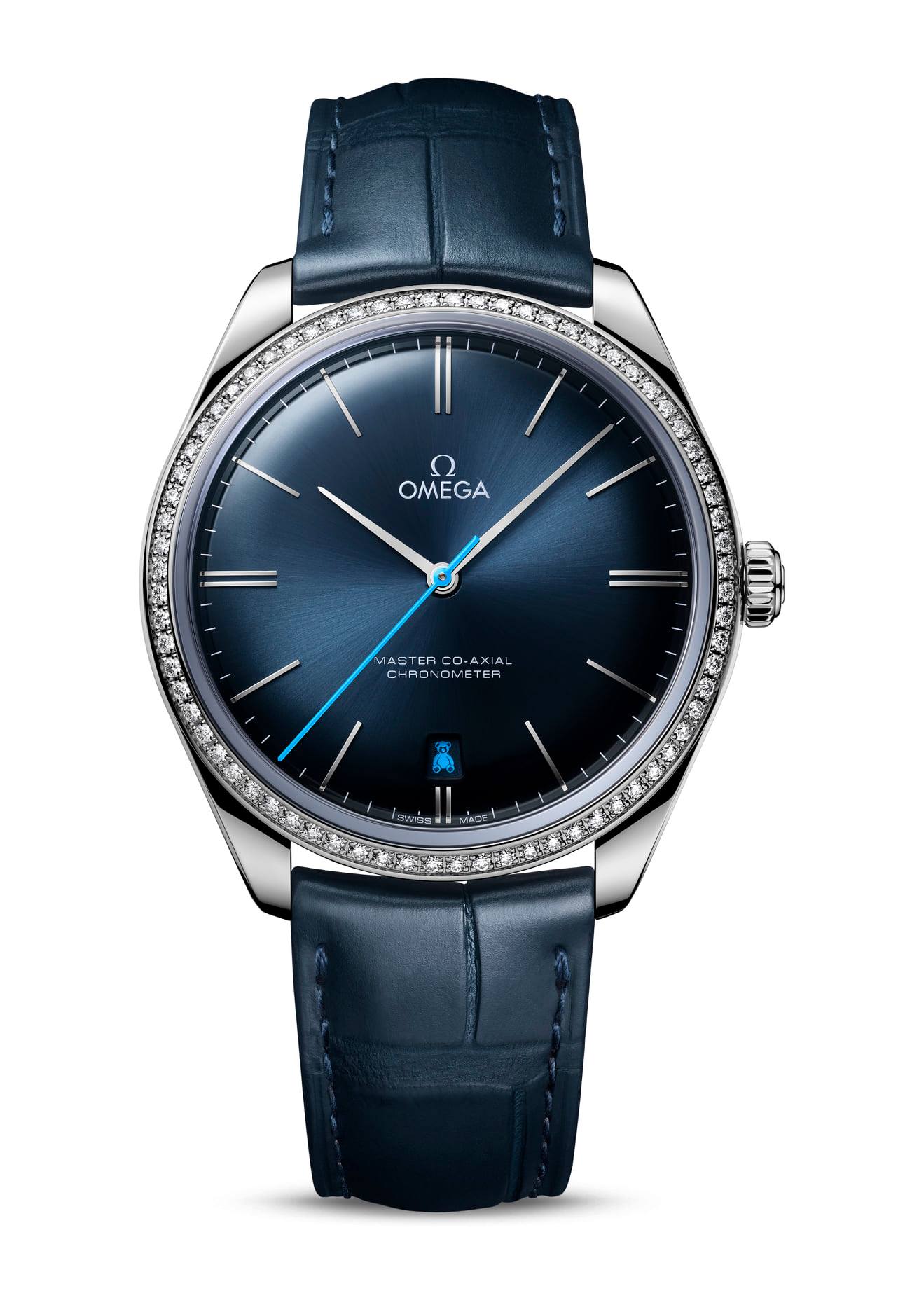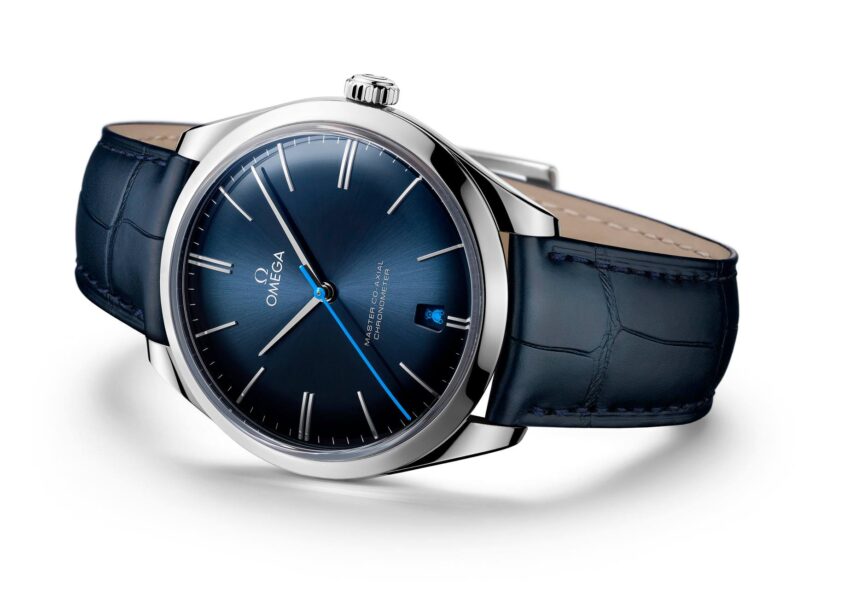 Cada modelo De Ville cuenta con la versión de lujo del Calibre 8511 de Omega, que posee un puente de órgano regulador de oro rojo de 18 quilates. Ambas piezas se abrazan al pulso gracias a una correa de piel azul con hebilla pulida.