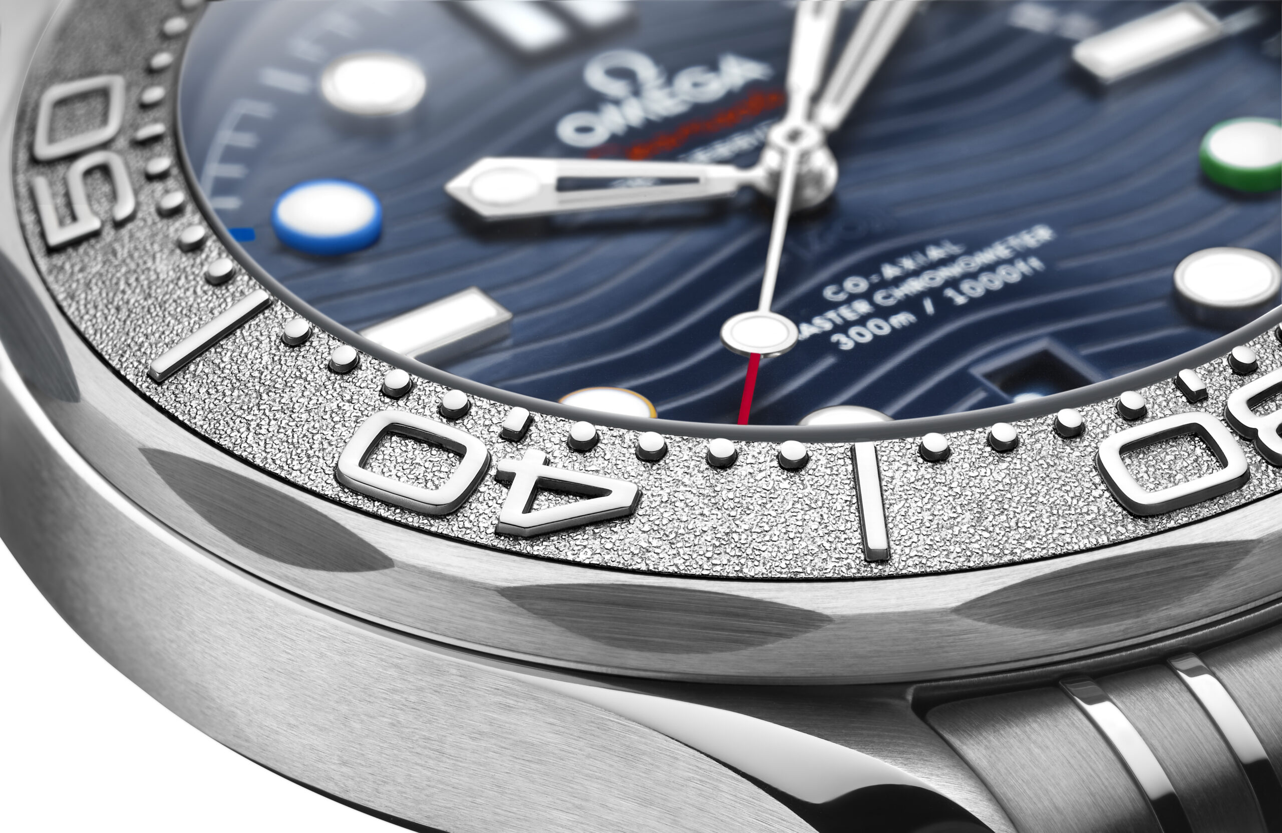- Carátula: cerámica azul con patrón grabado de olas; índices recubiertos con Super-LumiNova y decorada con los 5 anillos olímpicos; agujas esqueletadas en acero con acabado rodiado y tratamiento luminiscente
