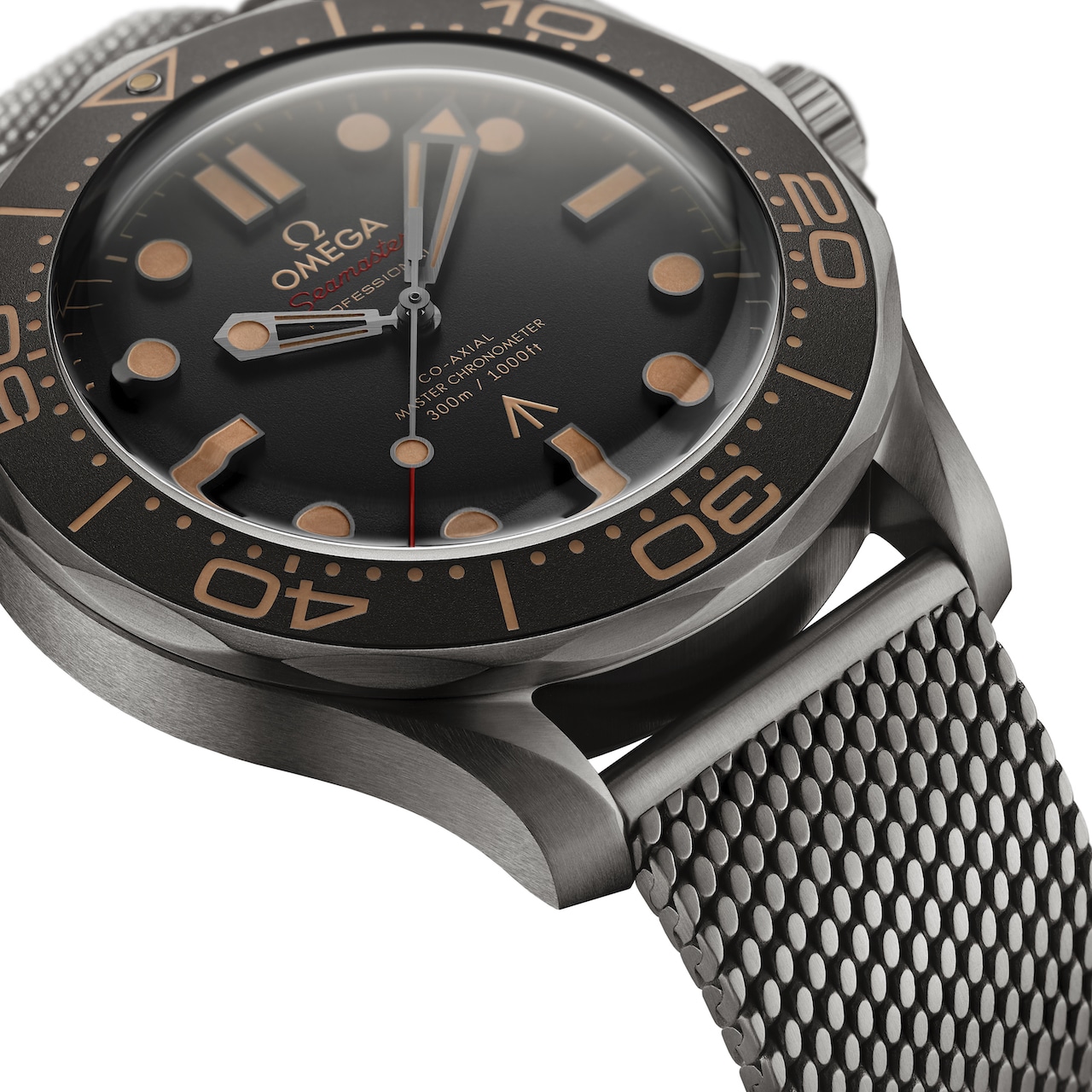 Primeramente, su caja y brazalete de malla son de titanio Grado 2, material fuerte y ligero, aunque también se vende con una pulsera NATO café, gris y beige. La carátula es de aluminio con un tono café vintage tipo “tropical” y el bisel giratorio unidireccional es del mismo material. El fondo tiene varios números con significado: 0552 es un código naval; 923 7697 es el número para un reloj de submarinismo; la letra A indica que tiene corona enroscada; 007 es la clave de Bond, y 62 se refiere a 1962, el año en el que se estrenó la primera película del agente.
